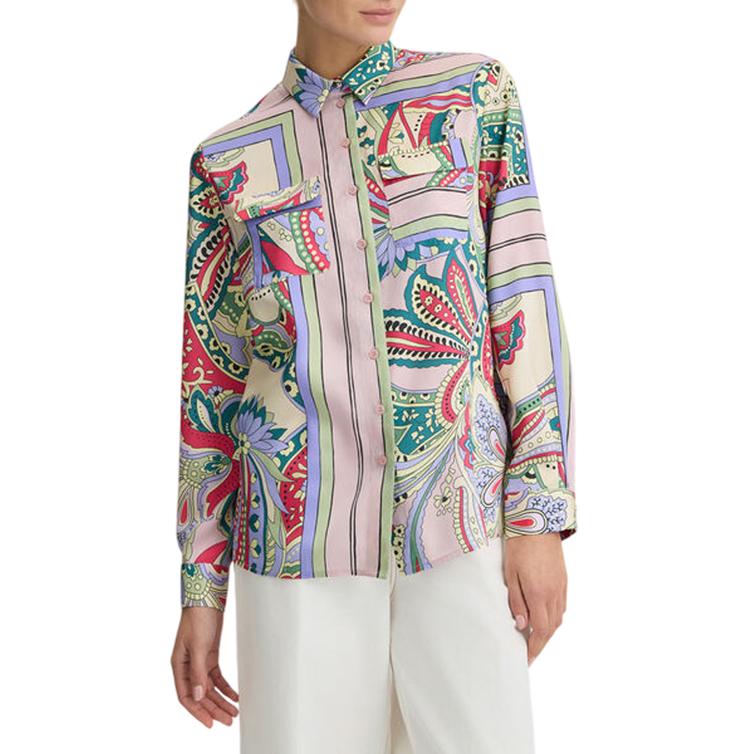 Camicia in raso multicolor Stampa foulard all over Colletto classico Taschini con patta sul petto Maniche lunghe Polsi con bottoni Lettering in metallo con strass sul retro Chiusura con bottoni
