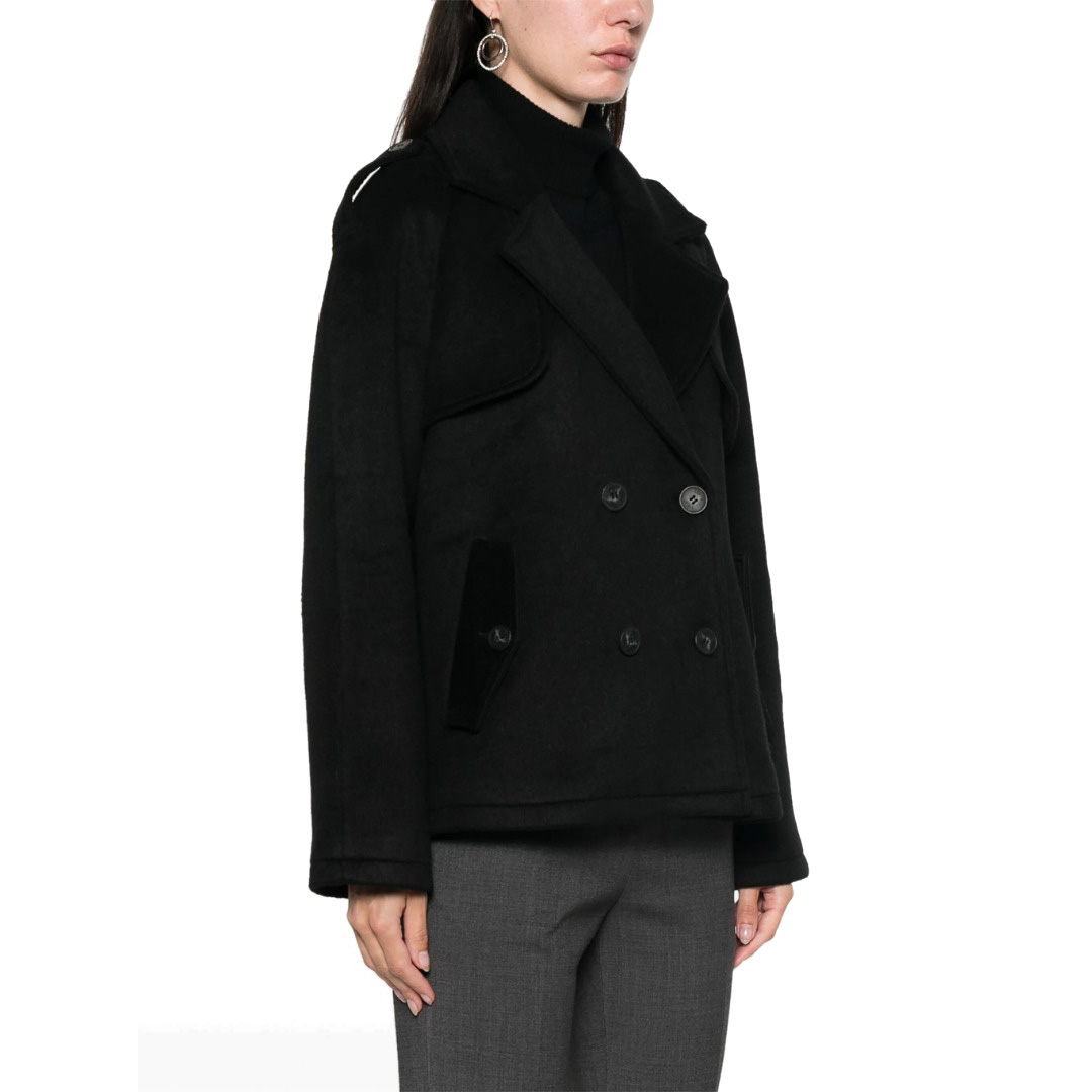 misto lana finitura in feltro chiusura doppiopetto con bottoni revers classici spalline maniche lunghe raglan pattina frangivento due tasche laterali con patta fodera integrale orlo dritto