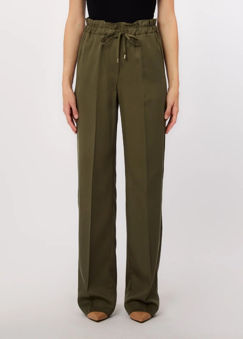 Pantalone modello palazzo Vita elasticizzata con coulisse regolabile Terminali coulisse in metallo Tasche laterali Tasche a filetto sul retro Gamba ampia e fluida Lunghezza regular