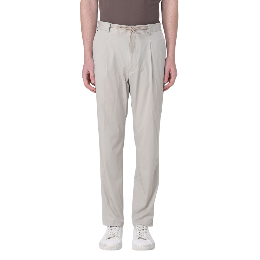 Pantalone jogging slim fit con una pinces, elastico e coulisse in vita, due tasche america frontali, due sul retroa filo con bottoncino, chiusura con zip, gancio e bottone, fondo 17 cm. Tessuto tecnico elasticizzato