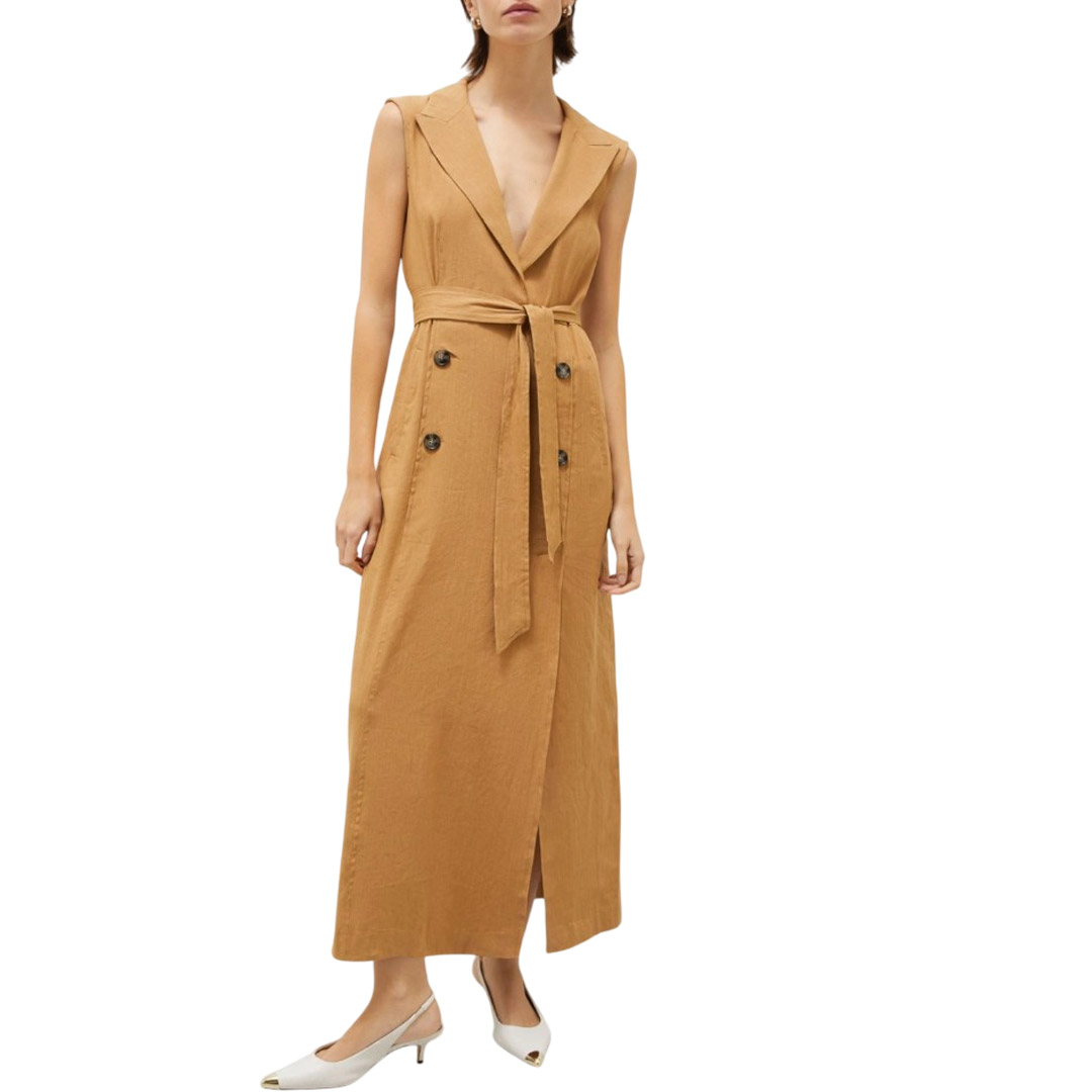 Abito robe manteau dal fascino sartoriale, smanicato per la bella stagione e con cintura da annodare in vita che spezza il rigore del doppio petto. Abito robe manteau in lino e viscosa stretch Scollo con rever Chiusura doppiopetto con bottoni estetici a vista Tasche laterali a filetto Modello smanicato con taglio in vita Cintura in tessuto coordinato
