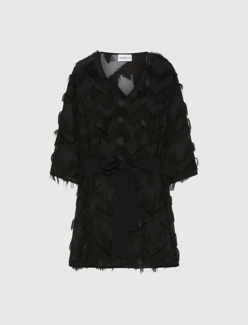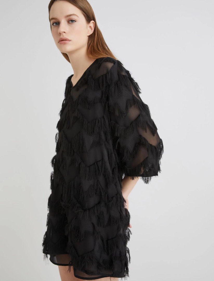 Corto, semi trasparente, ondeggiante: il mini abito in fil coupé è il pezzo chiave delle vostre serate, da completare con sandali e pochette scintillanti. Mini abito in fil coupé con disegno a stella Fit regolare Scollo a V Spalla scesa Fusciacca in georgette da annodare in vita Sottoveste rimovibile in georgette on tone
