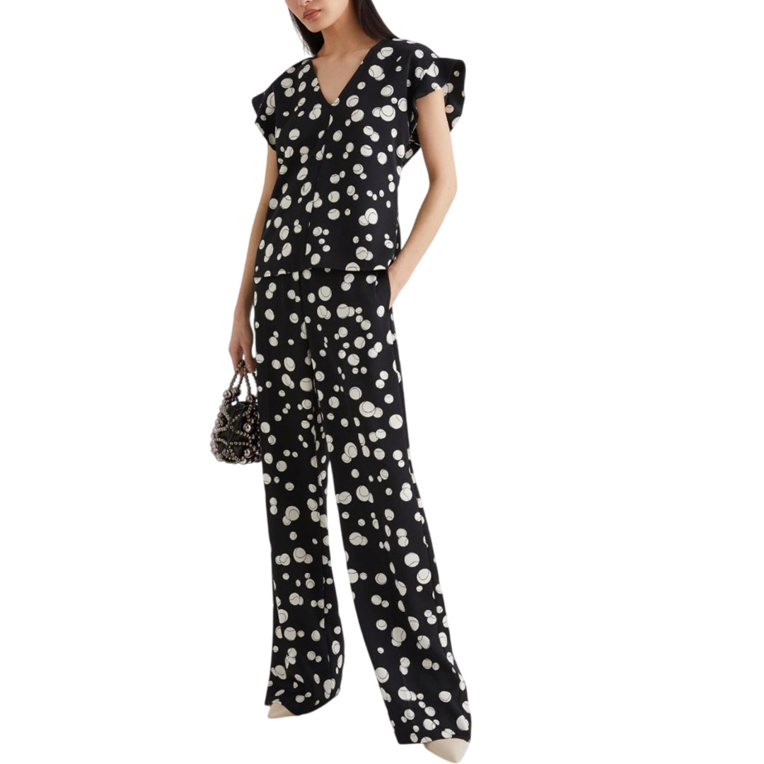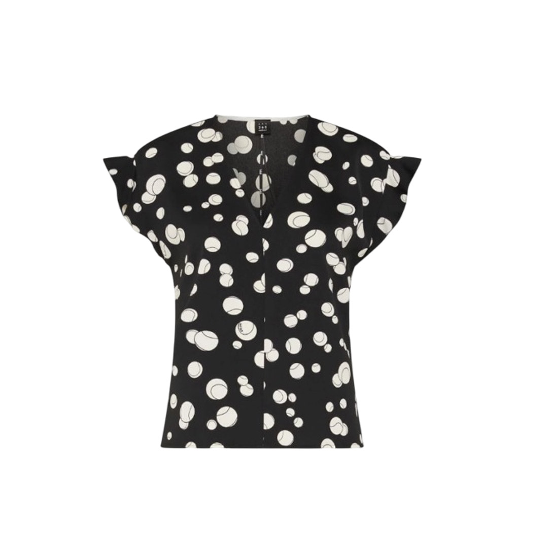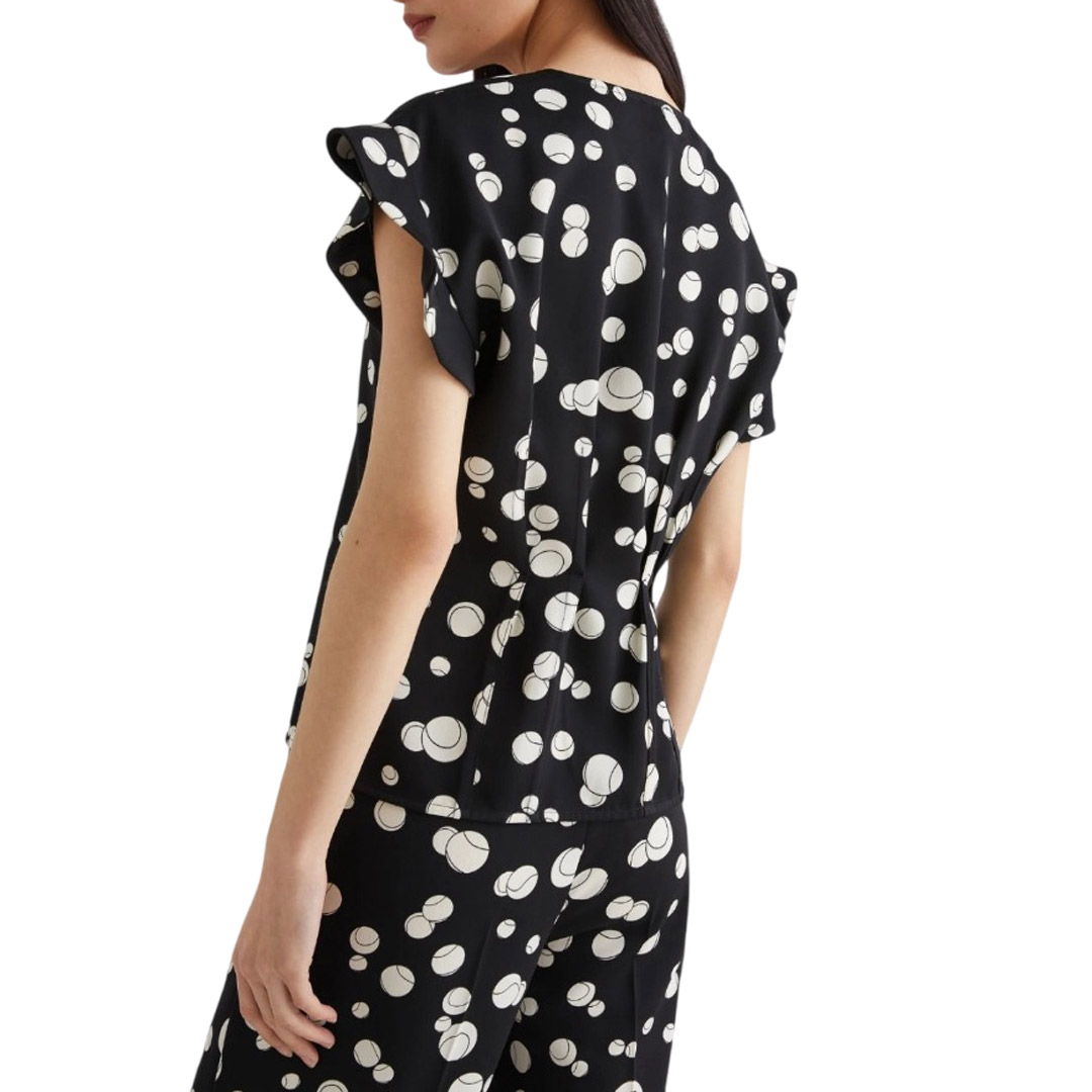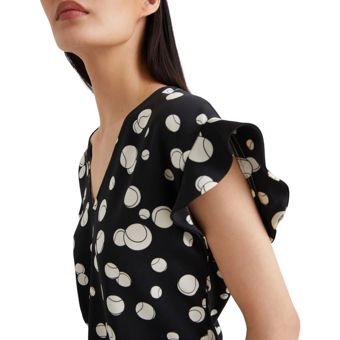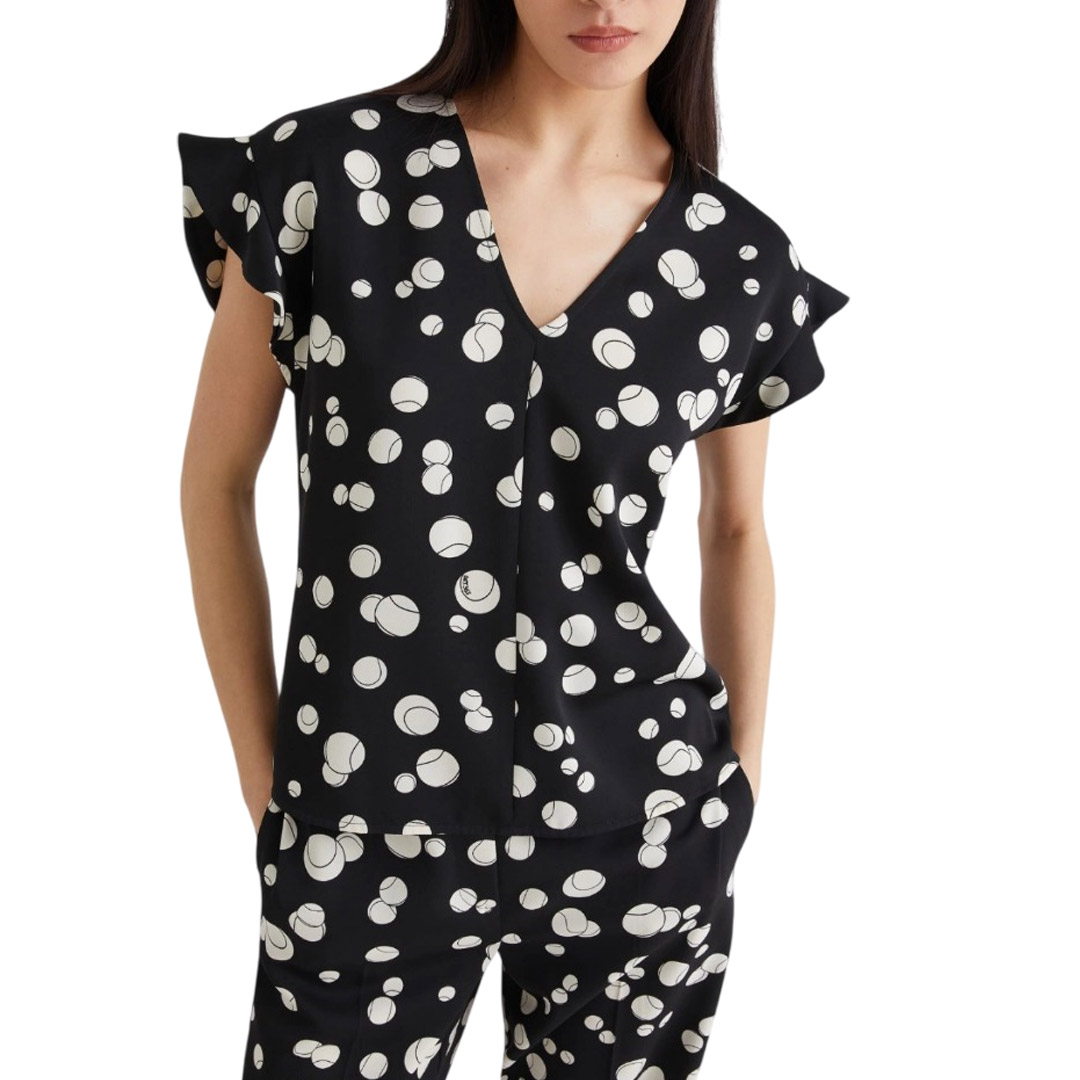 Luminosa nella nuova fantasia di stagione, la blusa in satin è sempre protagonista dei look quotidiani. Da infilare sotto un blazer durante il giorno, con spalle scoperte la sera. Blusa in satin stampato con motivo 365 ball machine Fit femminile leggermente sfiancato Scollo a V Apertura laterale con zip nascosta Maniche corte ad aletta Motivi di pince impunturate sul retro