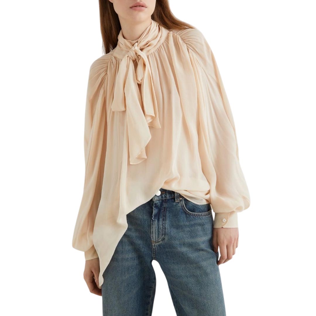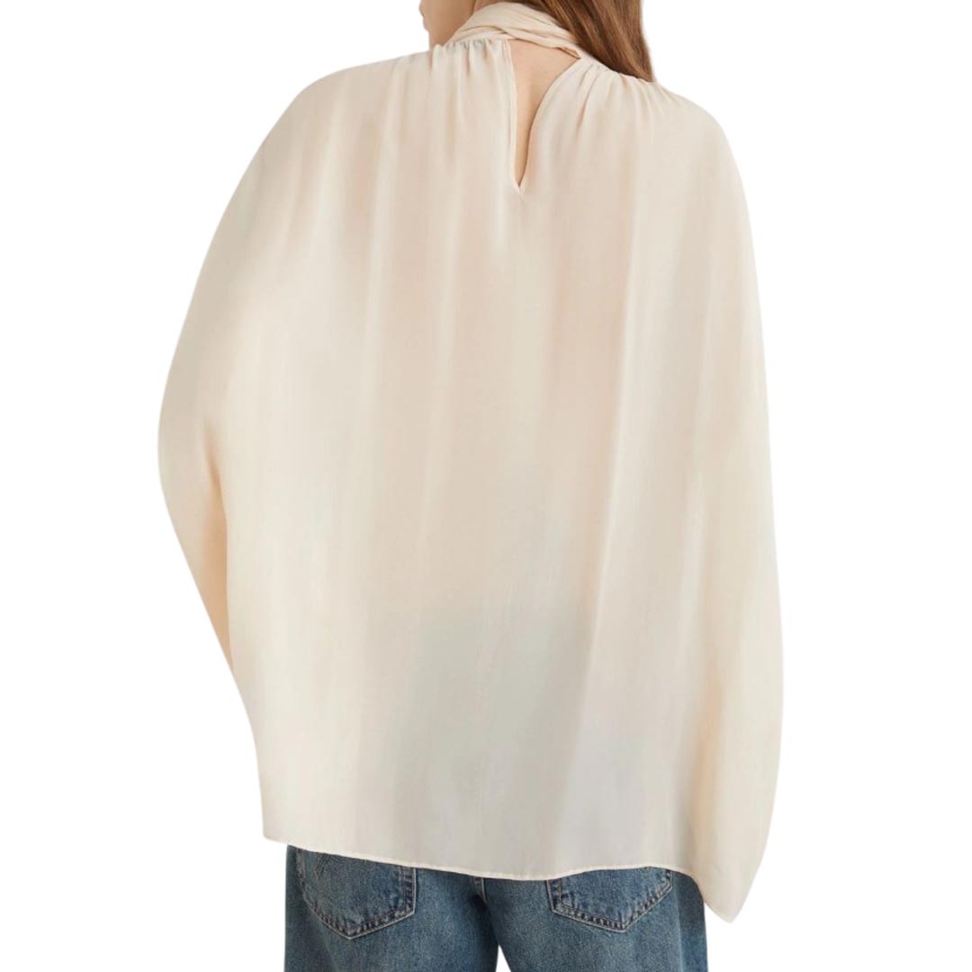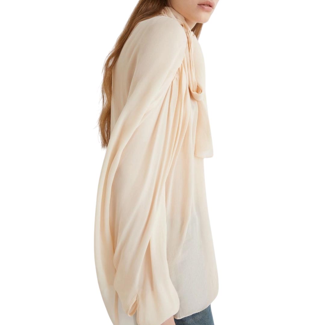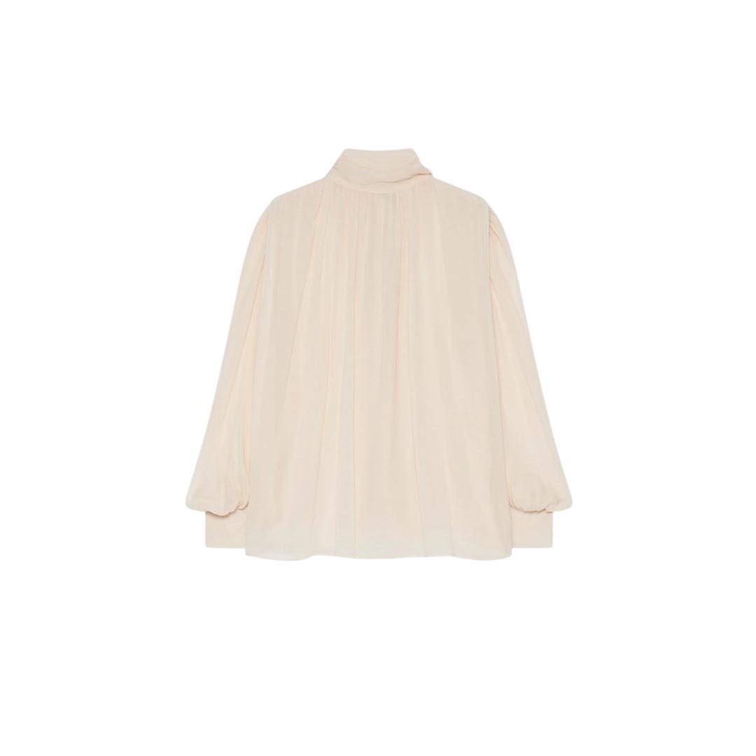 Tessuto principale contenente materie prime derivanti dalla cellulosa del legno, fibra ricavata nel rispetto del patrimonio forestale Blusa in georgette di viscosa Fit regolare Collo alto con chiusura posteriore a goccia e fiocco Motivo di arricci su tutto lo scollo Manica lunga con sbuffo al polso