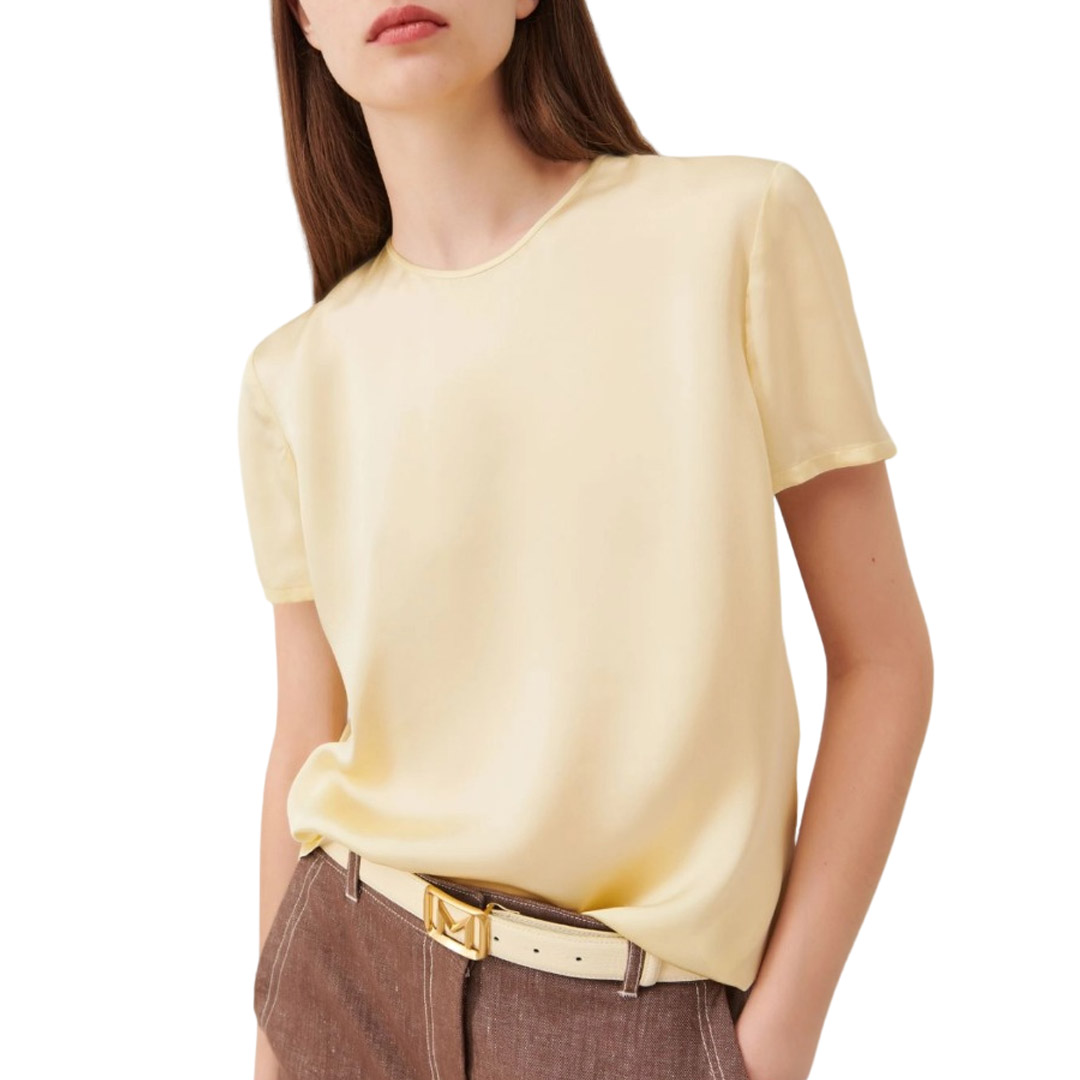 Blusa dalla vestibilità fluida realizzata in raso di seta. Modello dalla linea dritta con scollo a giro, maniche corte e chiusura con motivo a goccia sul retro. Blusa in raso di seta Linea dritta Scollo rotondo Maniche corte Chiusura a goccia con bottone sul retro