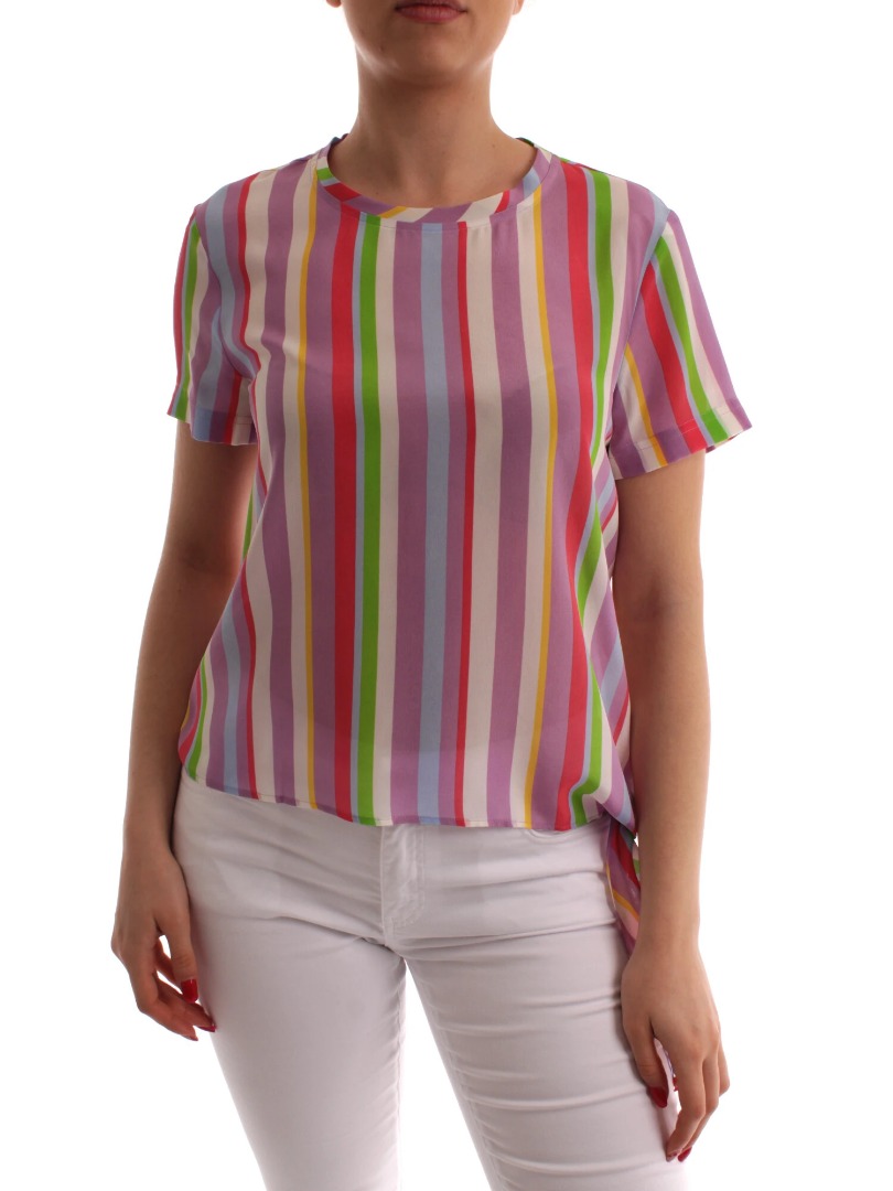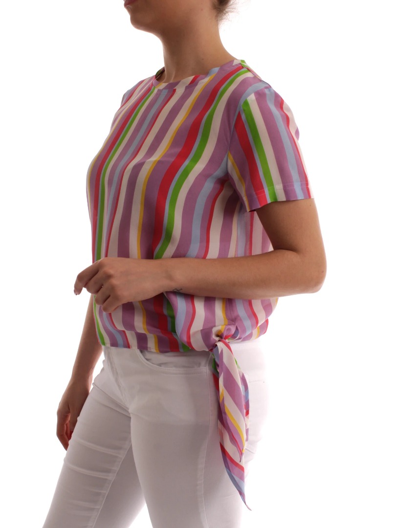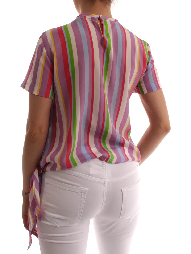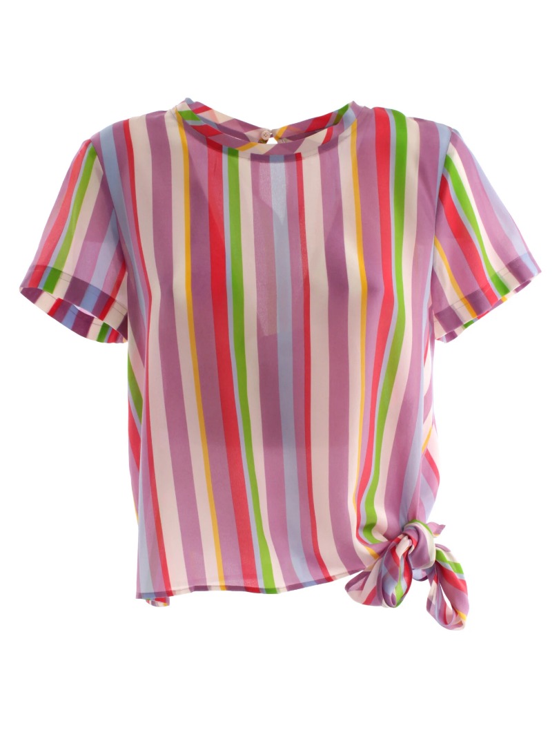 Blusa in crêpe de Chine di seta a fantasia, linea dritta con dettaglio di nodo laterale. Scollo rotondo, maniche corte. Chiusura a goccia con bottone sul retro.
