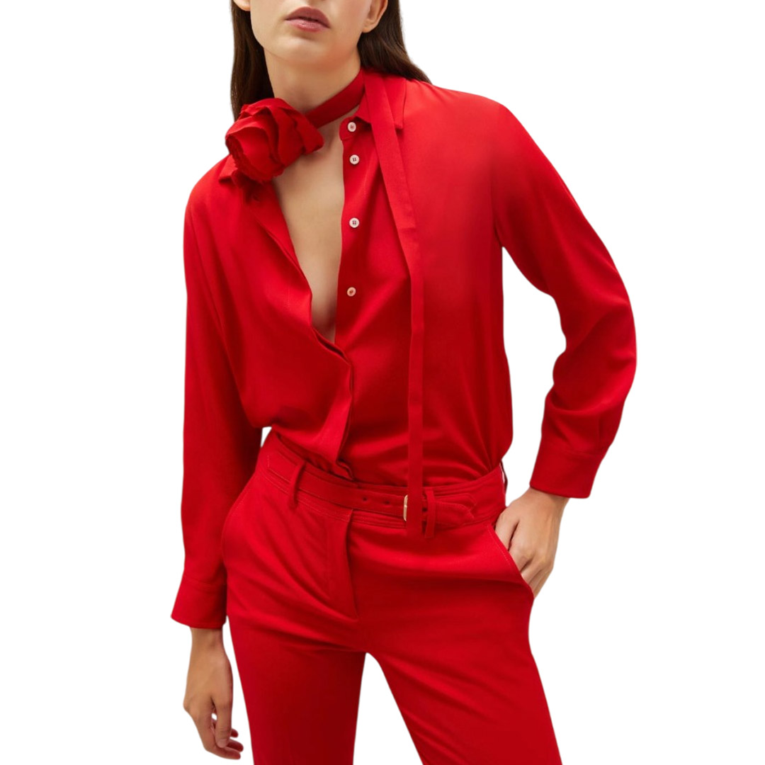 Ogni dettaglio di questa blusa fluida e ultraleggera in crêpe trasuda femminilità. La cintura con dettaglio maxi fiore in tessuto può essere annodata in vita o al collo, per giocare con lo stile. Questo articolo è composto da acetato derivato dalla cellulosa del legno, una fibra ottenuta in modo sostenibile per le risorse forestali. Camicia in crepe de chine misto seta Vestibilità attillata Chiusura con bottoni nascosti Cintura decorata con fiori Modello longline leggero