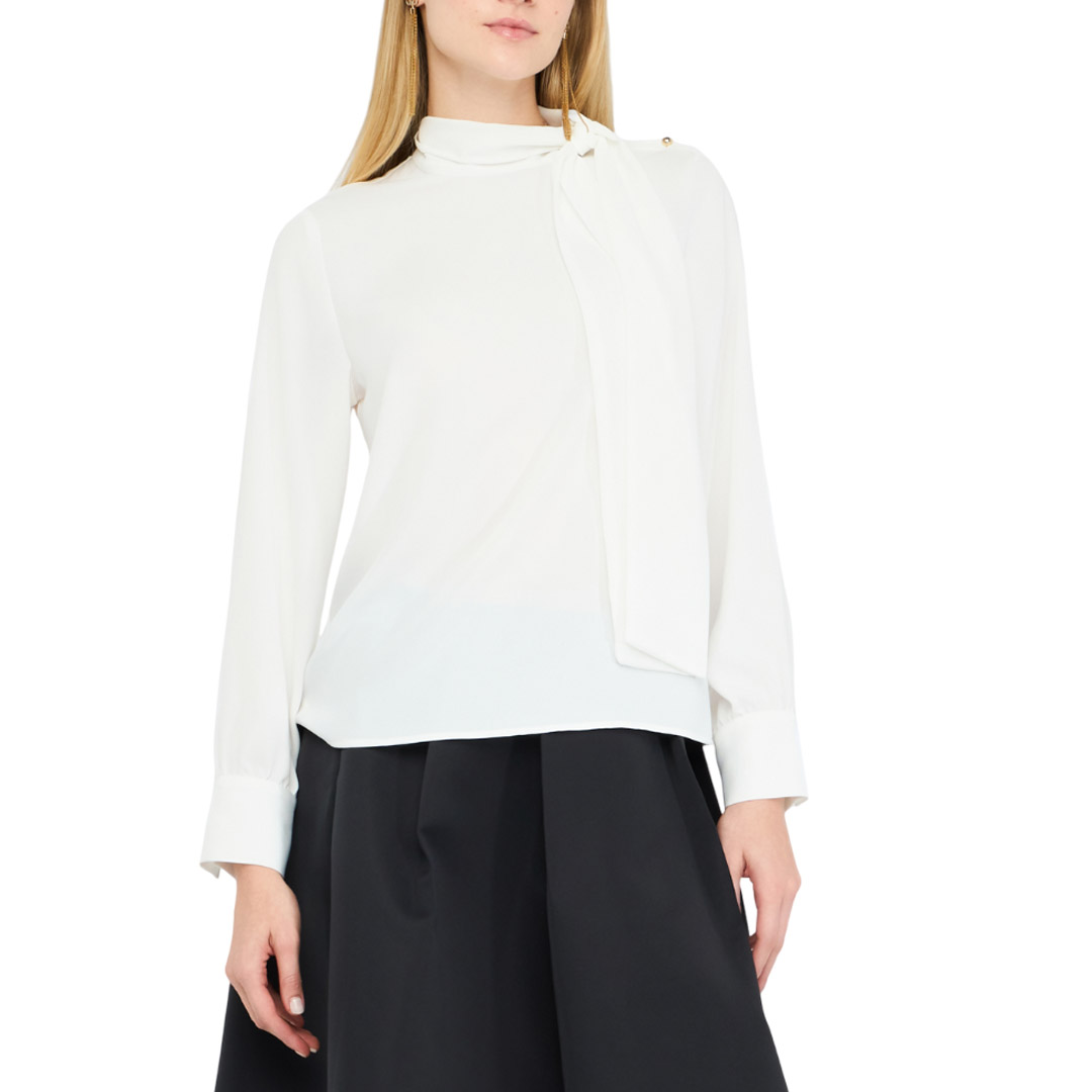Trasforma questa camicia in crêpe in un capo sorprendentemente stiloso con un semplice trucco: il fiore può essere indossato attorno al collo o alla vita. Il tessuto principale contiene materie prime derivate dalla cellulosa del legno, ottenute in modo sostenibile per le risorse forestali. Camicia in crêpe de chine Taglio dritto del corpetto Colletto a camicia e maniche lunghe con polsini Chiusura con bottoni rivestiti
