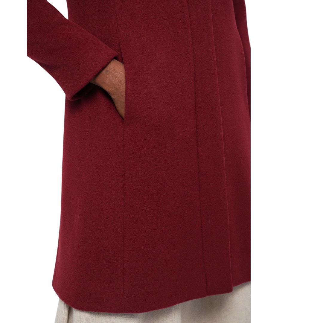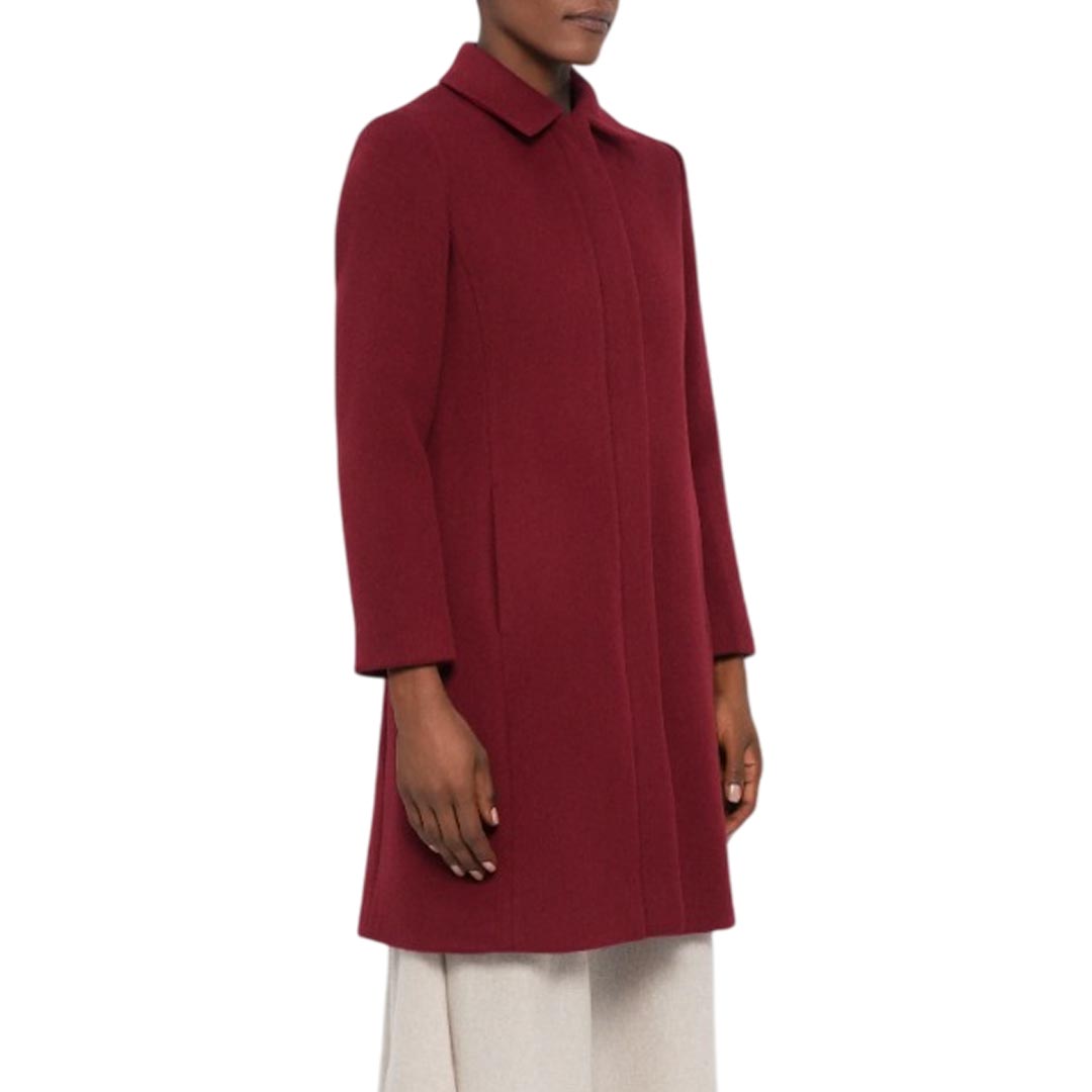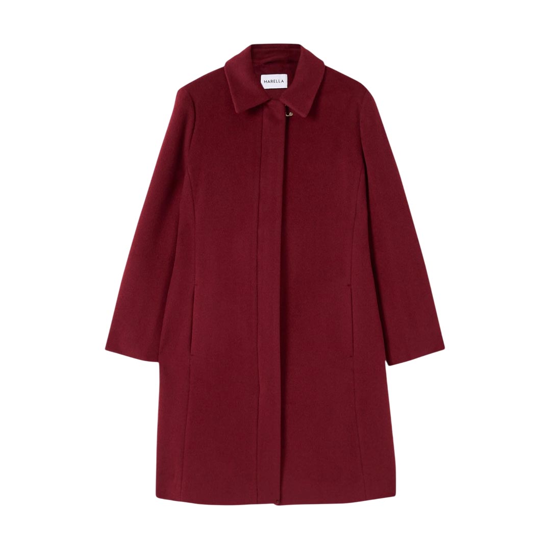 Cappotto lungo da donna Marella "Jusy", realizzato in lana di colore bordeaux. Elegante e minimal, presenta collo classico, chiusura frontale nascosta con zip, due tasche laterali a fessura e uno spacco posteriore per maggiore comfort nei movimenti. Un capospalla essenziale e sofisticato, perfetto per completare outfit invernali con stile.