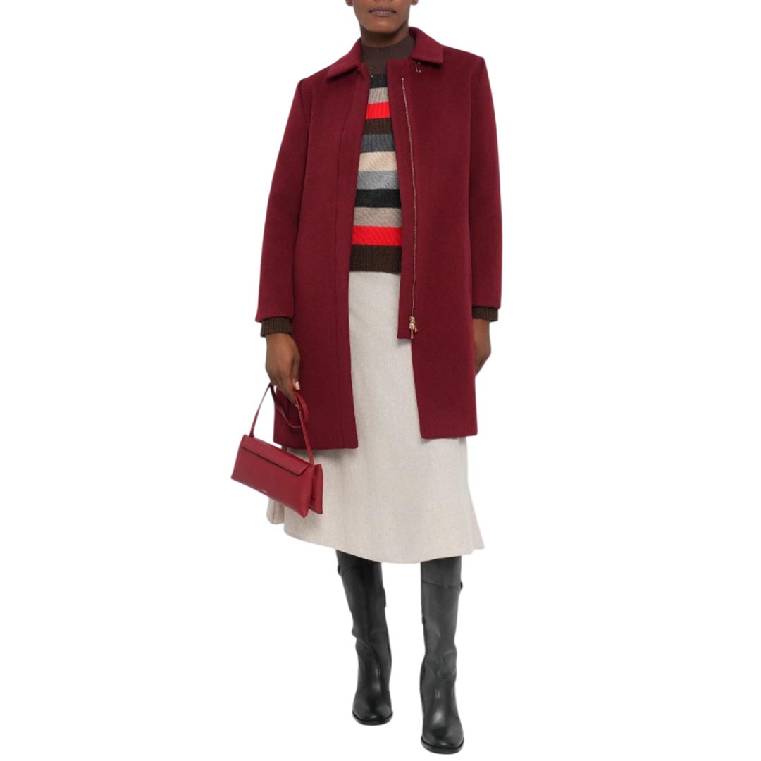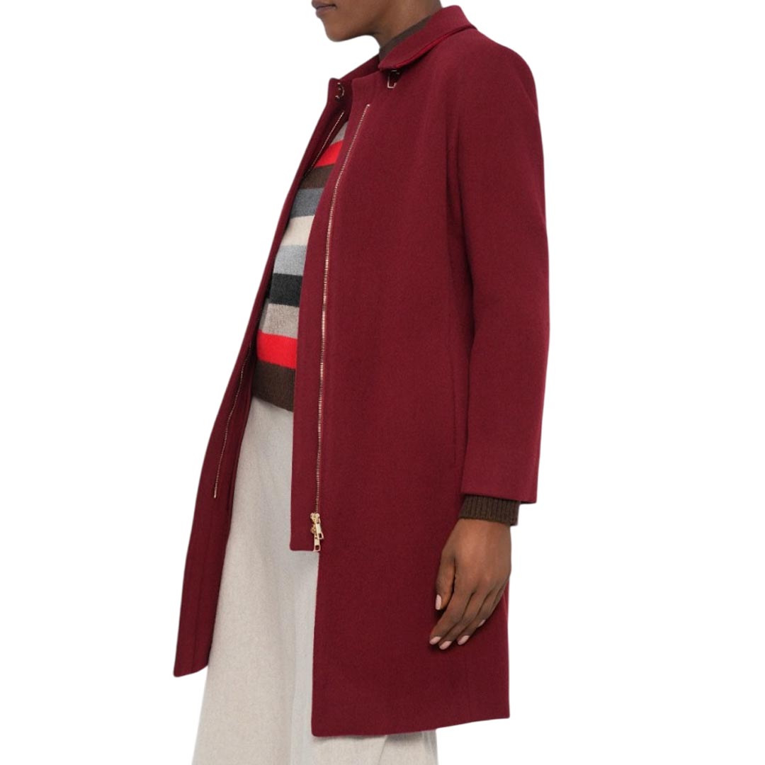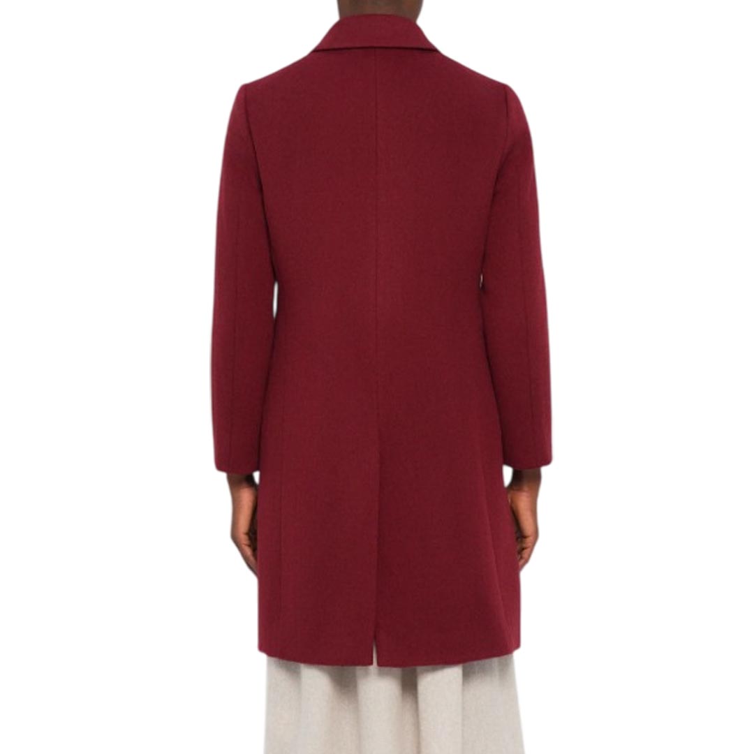 Cappotto lungo da donna Marella "Jusy", realizzato in lana di colore bordeaux. Elegante e minimal, presenta collo classico, chiusura frontale nascosta con zip, due tasche laterali a fessura e uno spacco posteriore per maggiore comfort nei movimenti. Un capospalla essenziale e sofisticato, perfetto per completare outfit invernali con stile.