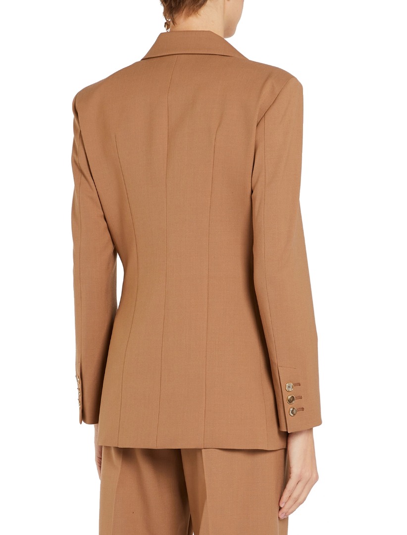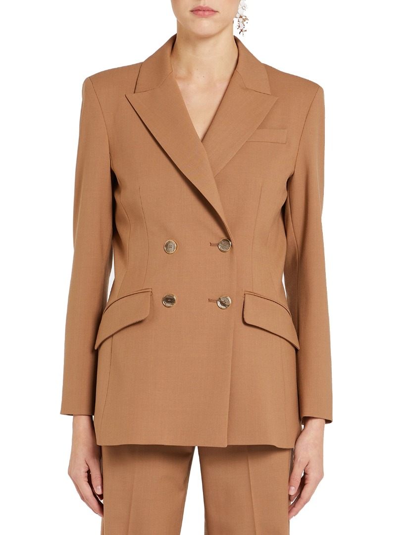 Blazer in tessuto diagonale di misto lana stretch. Fit sfiancato in vita. Scollo con rever. Chiusura doppiopetto con bottoni. Pince e fianchetti sagomati. Tasche laterali con doppio filetto e patta.