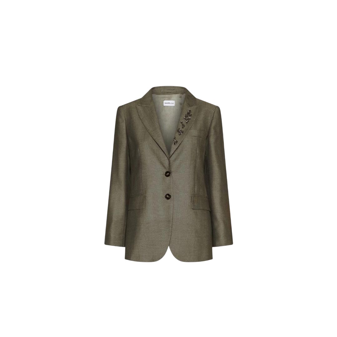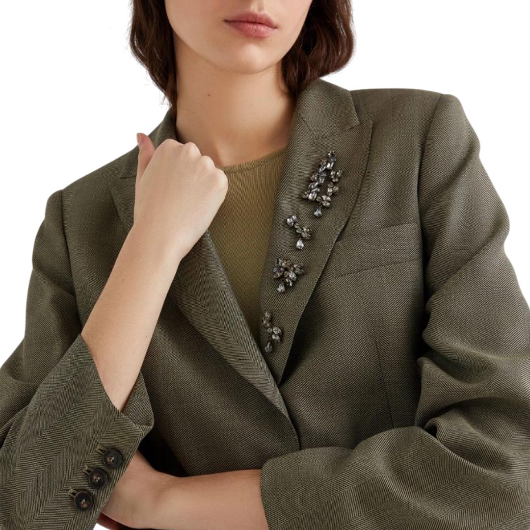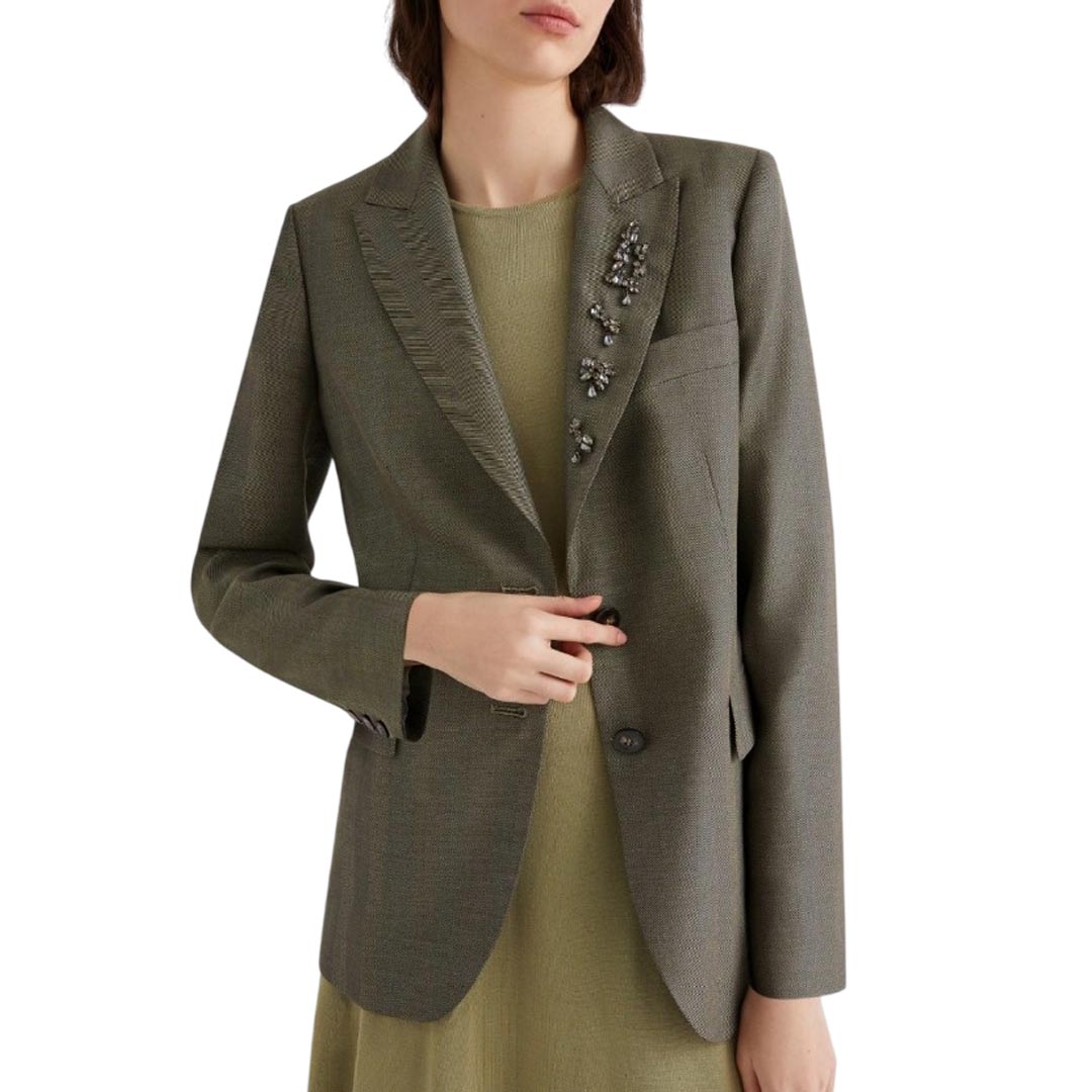 Il tocco scintillante dei cristalli sul rever trasforma un blazer in un capo da indossare anche nelle occasioni speciali. Provalo con un abito lungo e la pochette, il risultato sarà sorprendente. Giacca in saglia fluida effetto resca Fit femminile regolare Scollo con rever e ornamento con cristalli ricamati Tasche laterali con patta e filetto Spacco centrale posteriore Pince sul davanti