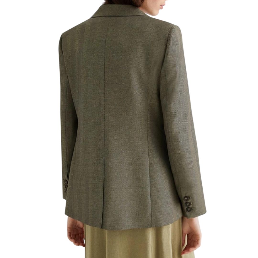 Tessuto 46% lana vergine, 31% poliestere, 23% viscosa; fodera fusto 64% acetato, 36% poliestere; fodera maniche 60% acetato, 40% viscosa.