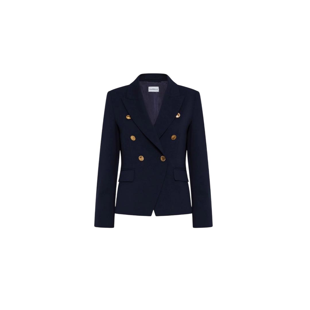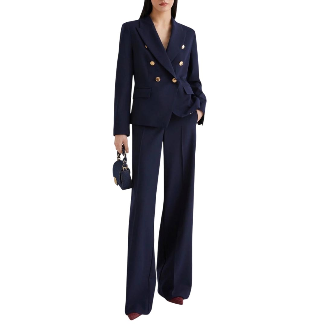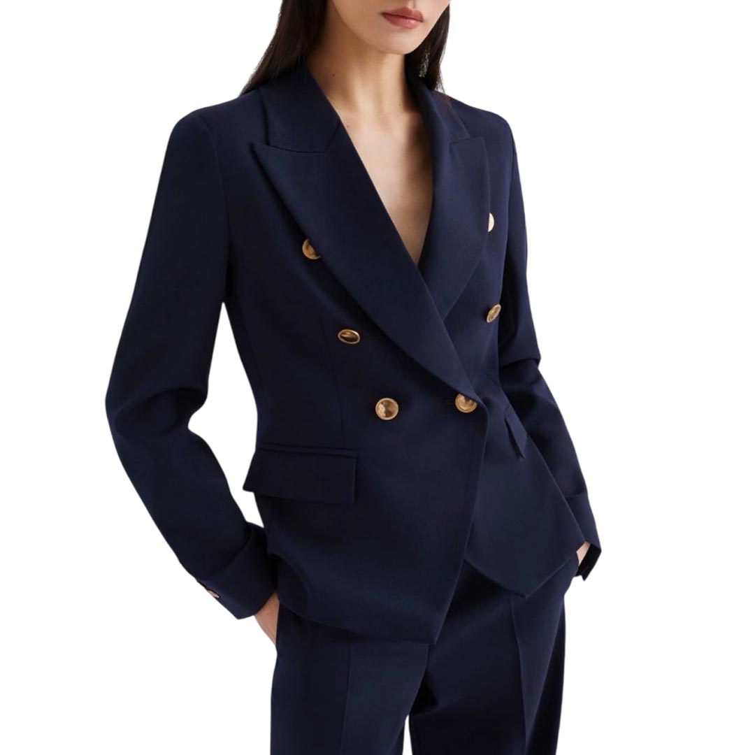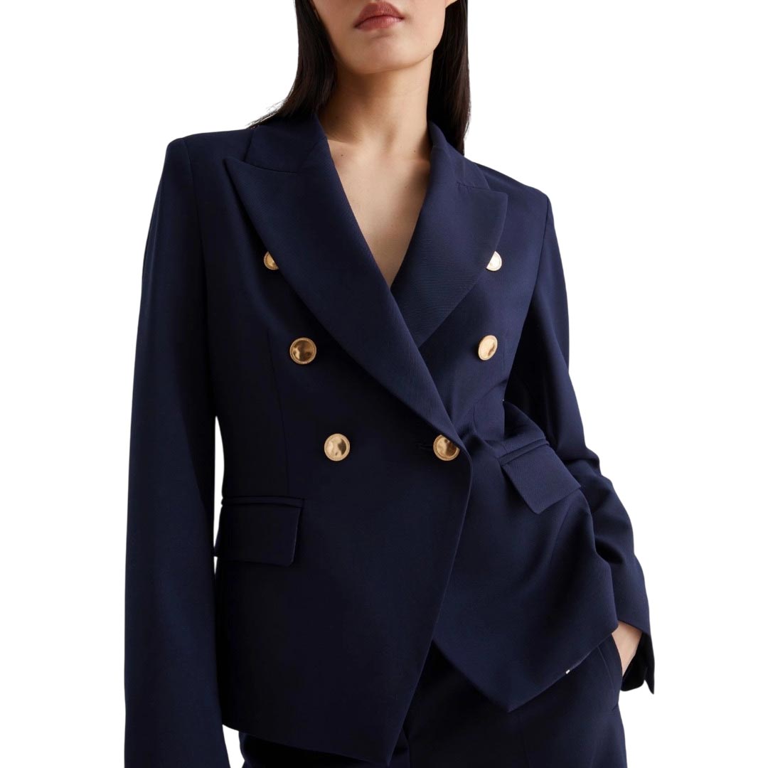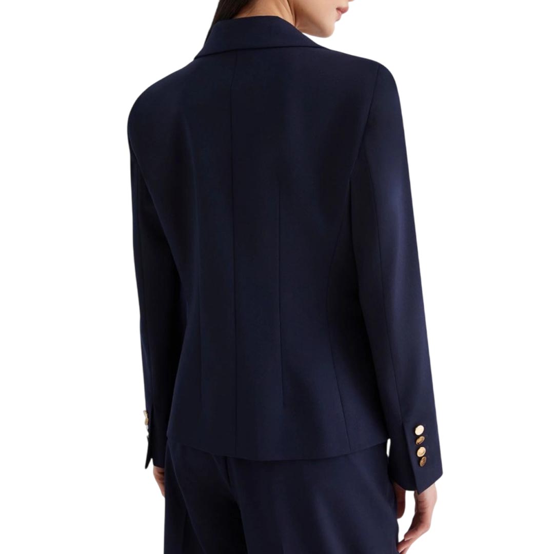 Blazer femminile dal carattere deciso, con una chiusura doppiopetto enfatizzata dai bottoni metallici personalizzati. Silhouette in evidenza da completare con panta palazzo e tacchi importanti. Giacca in tessuto diagonale di misto lana stretch con fodera interna Fit leggermente aderente Scollo con rever Chiusura a doppiopetto con sei bottoni Tasche laterali con patta Pince sui fianchi davanti e sul retro