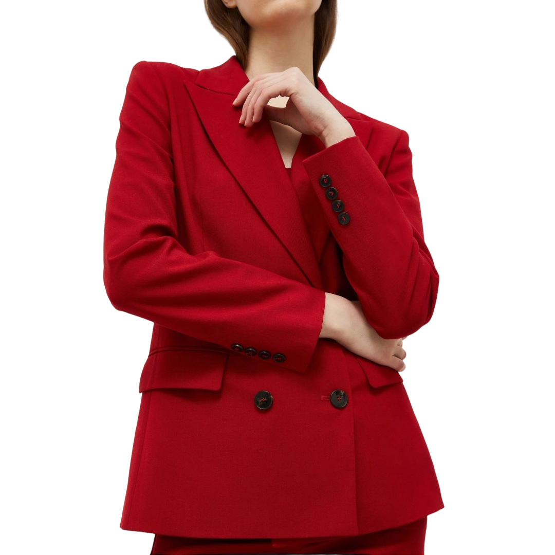 Blazer in cotone stretch con baschina asimmetrica, linea semiaderente. Scollo a V, maniche lunghe. Chiusura a doppio petto con bottoni a vista ricoperti in tessuto. Taglio in vita con pince. Foderato.