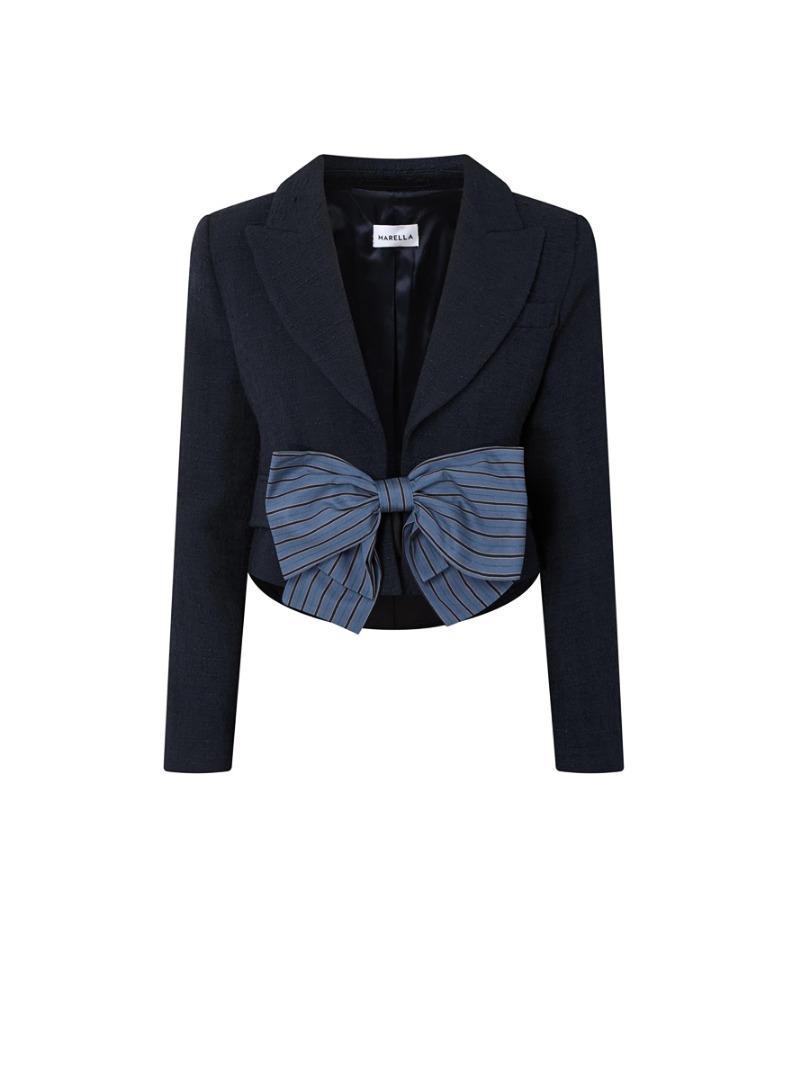 Giacca Marella Mllfibbia con nastro, realizzata in tessuto di cotone, modello dalla silhouette dritta, lunghezza accorciata, collo a revers, maniche lunghe, tasche applicate, maxi nastro con motivo a righe in tonalità contrastanti.