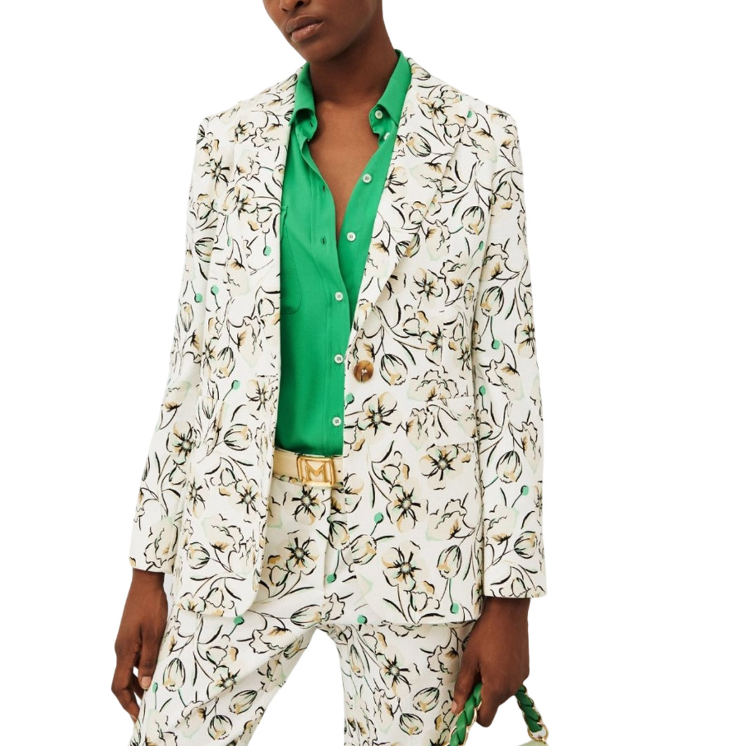 Blazer monopetto dall'allure femminile realizzato in stuoia stretch a fantasia floreale, collo a rever, maniche lunghe a giro e tasche con patta. Blazer in stuoia di cotone stretch a fantasia Linea dritta Collo a rever, maniche lunghe Chiusura con bottone, tasche con patta Spacco centrale sul retro