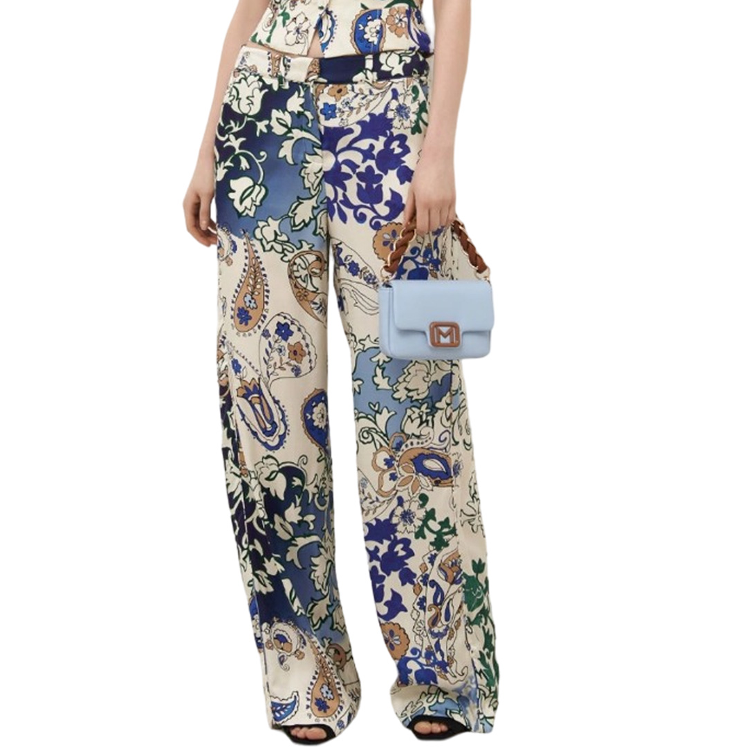 Bohemienne e raffinati, fluidi e metropolitani, i pantaloni in raso sono la nota leggera che introduce la stagione di transizione. Effortlessly chic. Tessuto principale contenente materie prime derivanti dalla cellulosa del legno ricavata nel rispetto del patrimonio forestale. Pantaloni in raso stampato Linea wide leg Chiusura con gancio e zip nascosti Tasche alla francese davanti, singola a filetto dietro Piega stirata fronte e retro
