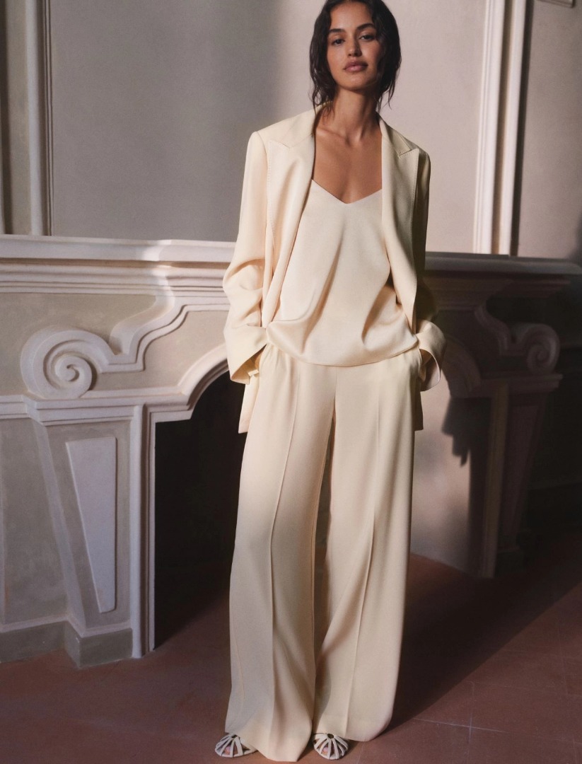 È impossibile resistere all'elegante fascino dei pantaloni in crêpe. Puliti in vita, con una piega che slancia la silhouette e tasche laterali che aggiungono funzionalità. Scegli la tua tonalità e abbinali al top o al blazer coordinati. Il tessuto principale contiene materie prime derivate dalla cellulosa del legno, una fibra prodotta nel rispetto delle risorse forestali. Pantaloni Envers in crêpe di raso Taglio regolare Chiusura laterale con cerniera Tasche laterali oblique Piega dei pantaloni davanti e dietro