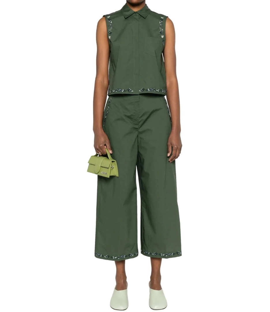 La nota sofisticata del ricamo trasforma questo pantalone in un capo dalla grazia tutta femminile. Provalo con il top o la camicia coordinata, per un mix dall'eleganza raffinata. Il cotone che compone questo articolo è biologico, fibra proveniente dalla coltivazione biologica della pianta del cotone Pantalone sfoderato in popeline di puro cotone con ricami Fit ampio Chiusura con gancio a uomo e zip Inserto elastico sulla cintura dietro Tasche laterali alla francese