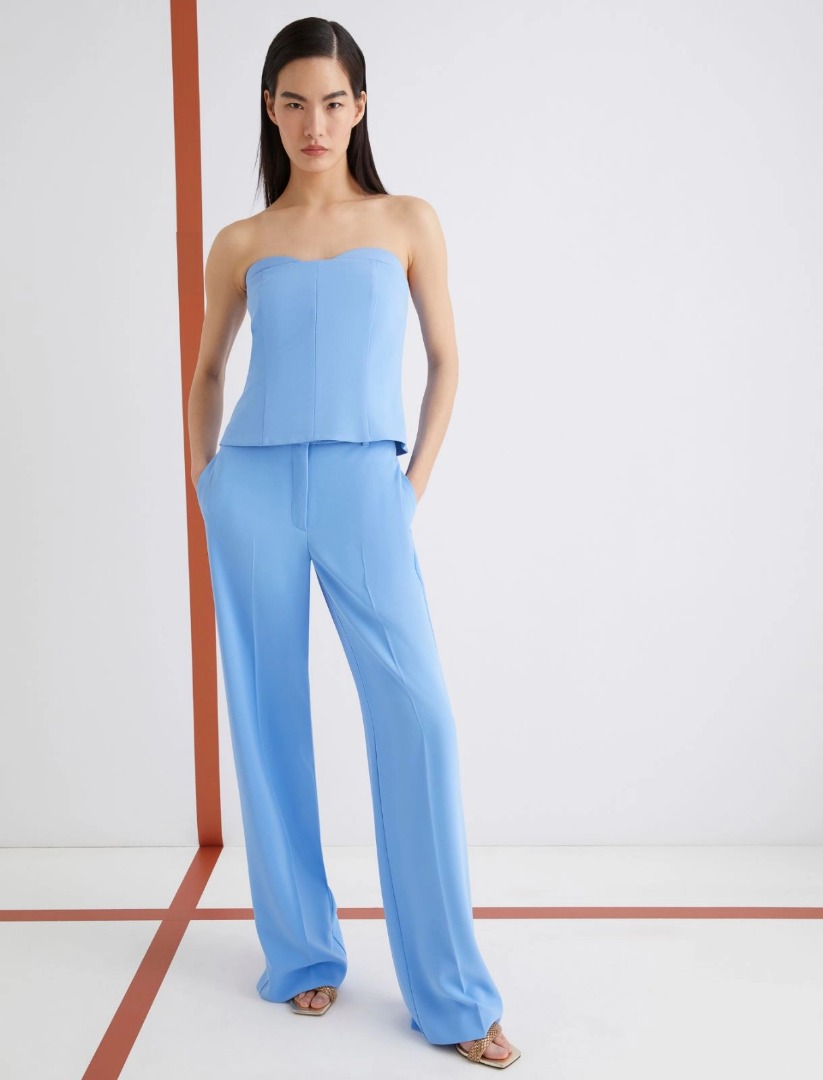 Pantalone elegante realizzato in envers satin, con costruzione ispirata alla sartoria maschile. Le nuance luminose introducono la nuova stagione, suggerendo abbinamenti versatili, dal bustier alla giacca doppiopetto. Tessuto principale contenente una percentuale di poliestere riciclato superiore al 50% Pantalone in envers satin Fit dritto Chiusura con gancio a uomo e zip Tasche laterali inserite e posteriore singola a filetto Piega stirata fronte e retro
