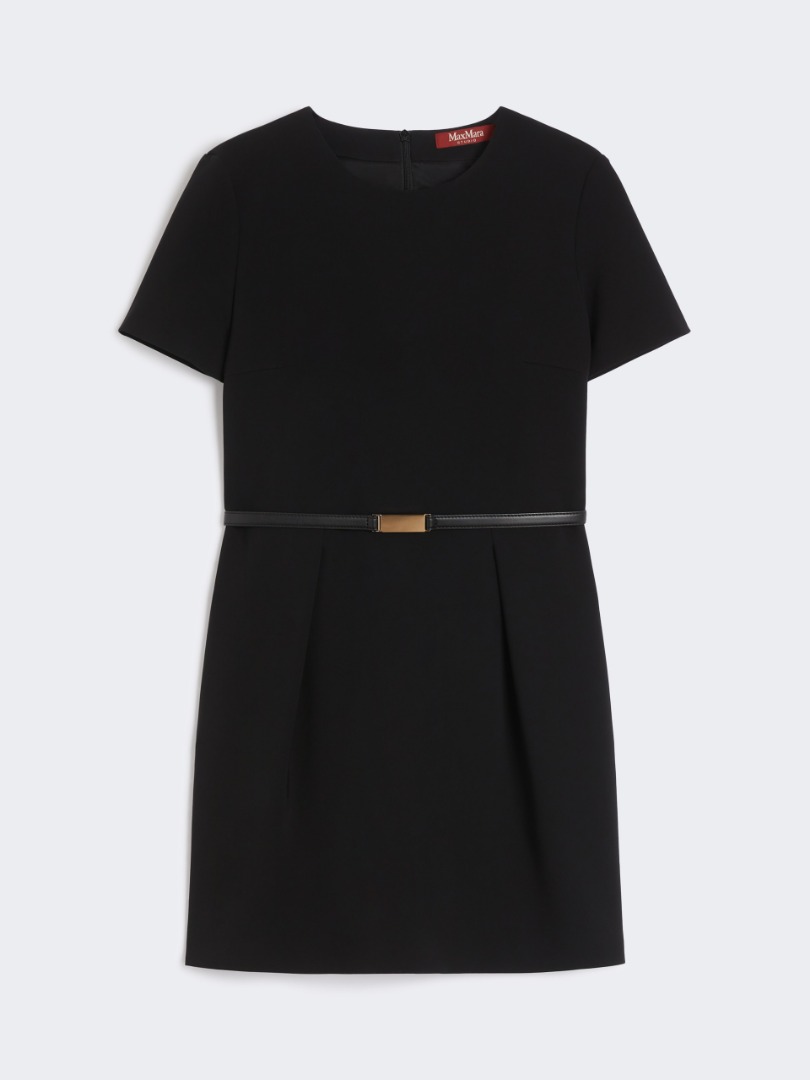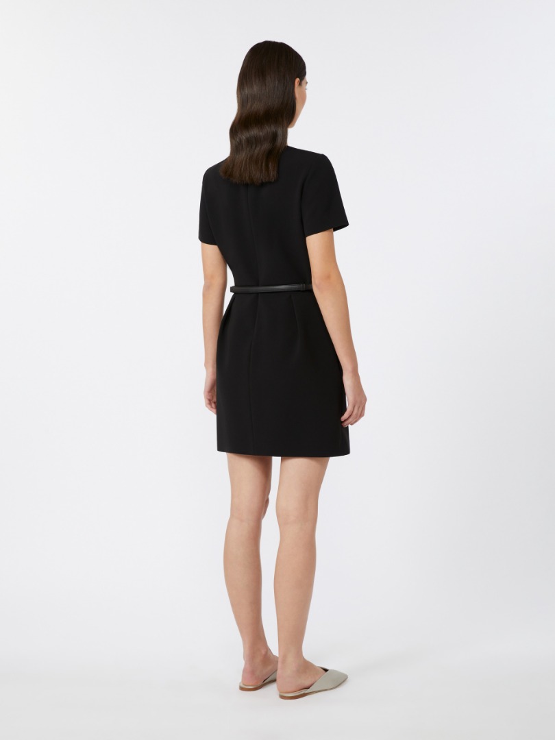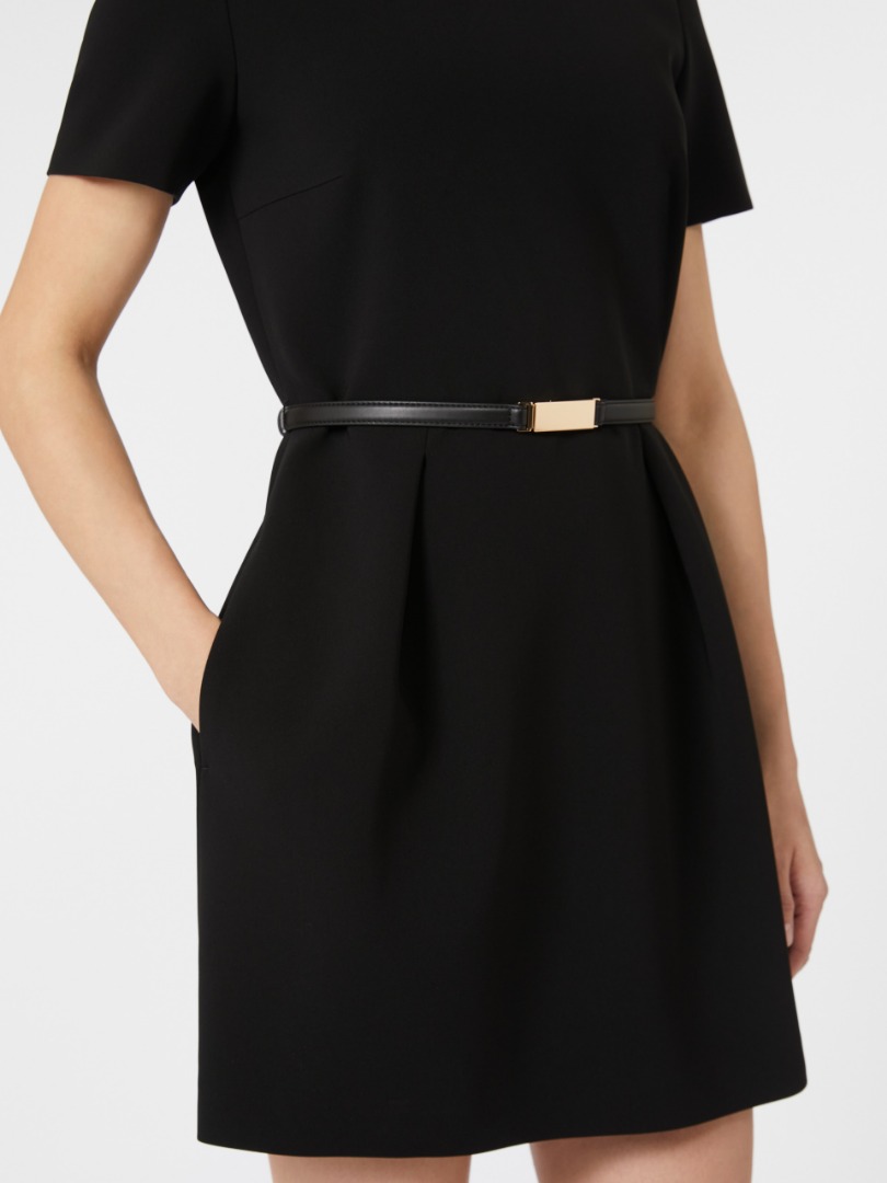 Abito corto con gonna a tulipano, vita alta e motivo a pieghe sfumate che dona volume. Abito in cady Girocollo Maniche corte a giro Chiusura con zip sul retro Tasche inserite nei fianchi Cintura abbinata in tessuto spalmato Foderato