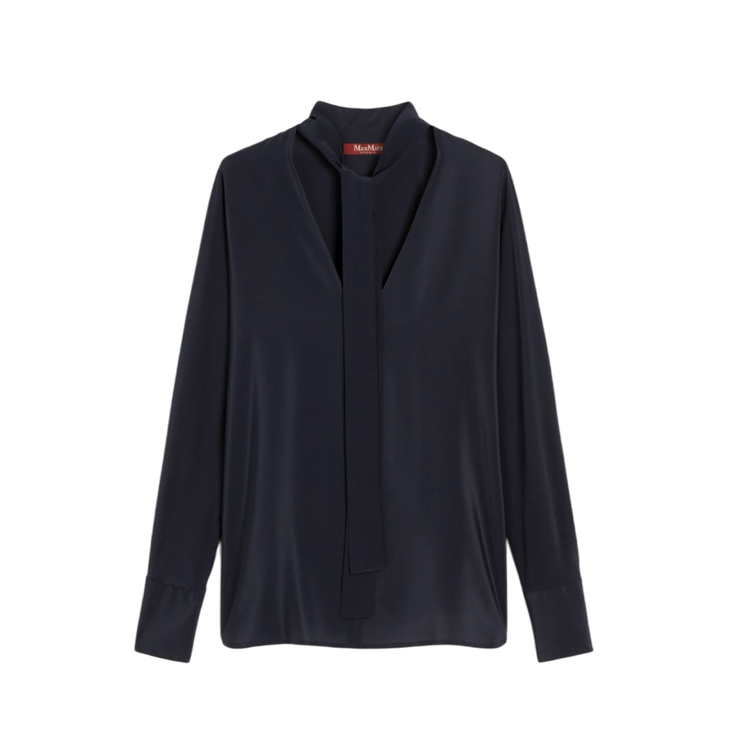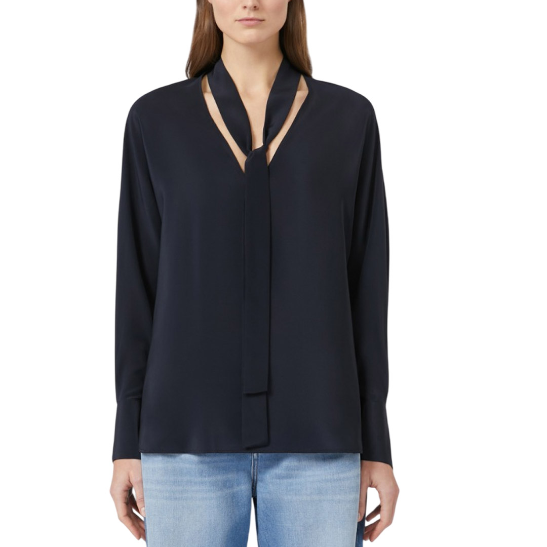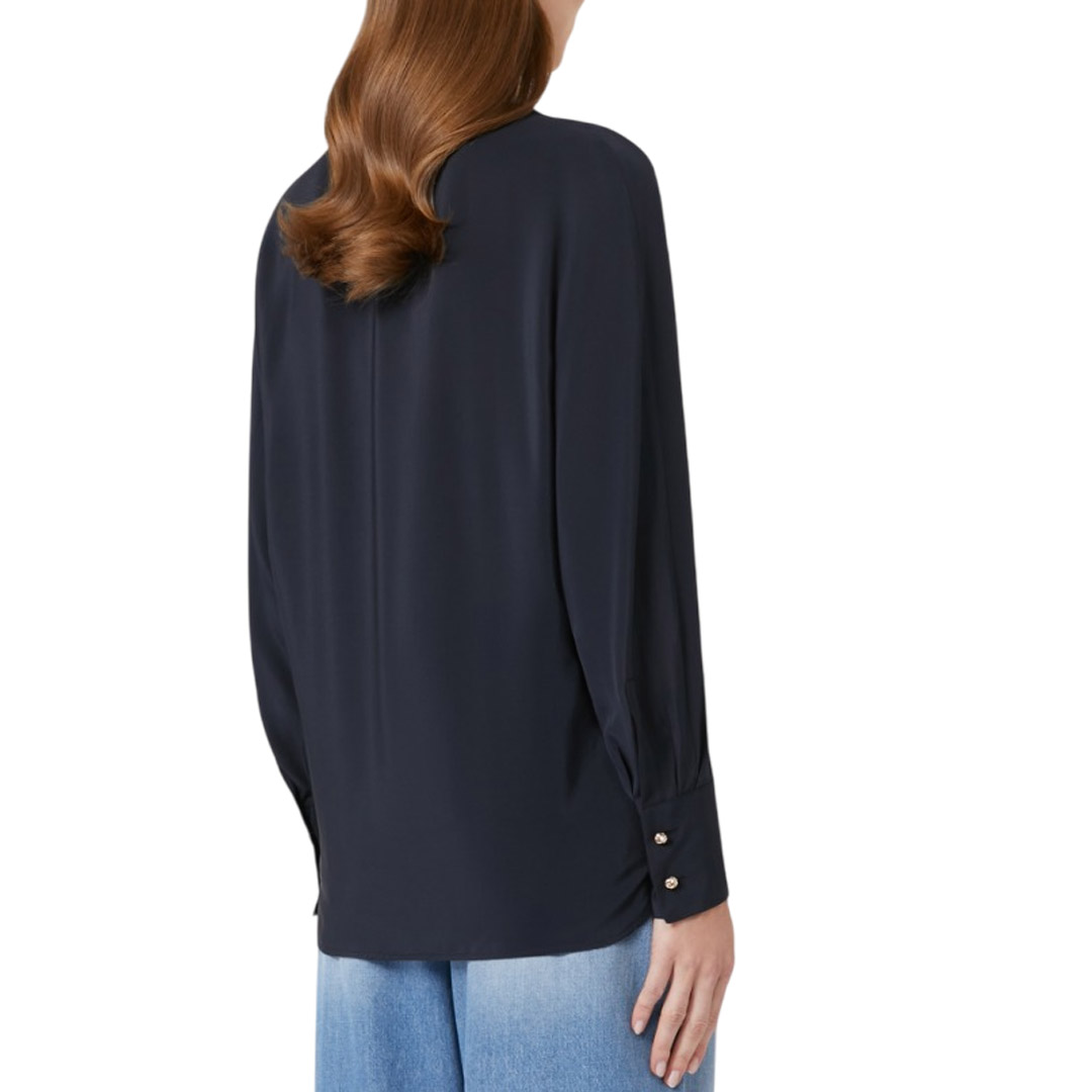 Blusa con fusciacca a cravattino da annodare sul collo. Blusa in crêpe de Chine di pura seta Linea morbida Scollo a V Ampie maniche lunghe a kimono Polsini alti a camicia con doppio bottone gioiello Fondo stondato con spacchetti laterali