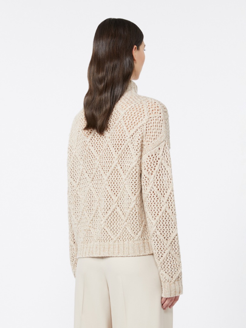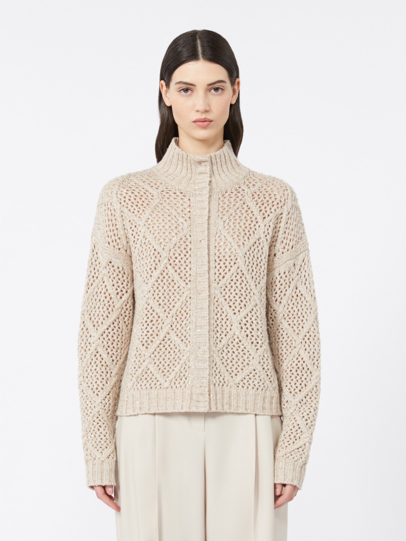 Cardigan lana e cachemire arricchito da un ricamo di paillette all over che conferisce luminosità al capo. La lavorazione a costine definisce il collo, i polsi e i bordi. Cardigan in filato di lana e cachemire Vestibilità comfort fit con silhouette rilassata Collo alto a costine Maniche lunghe a giro basso Chiusura frontale con bottoni nascosti, polsi e bordo a costine Motivo a losanghe e rete all’interno