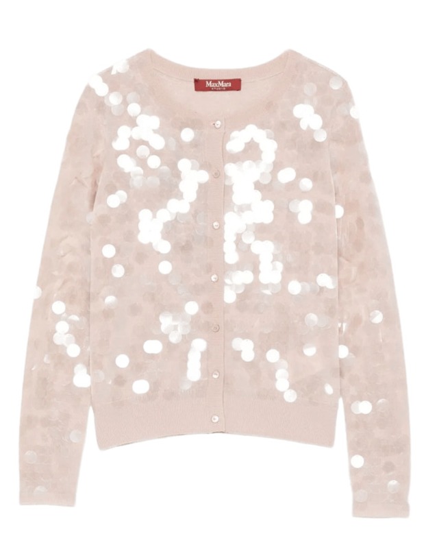 Cardigan 'Necton' in maglia di lana, girocollo, macro paillettes all over, chiusura frontale con bottoni, maniche lunghe.