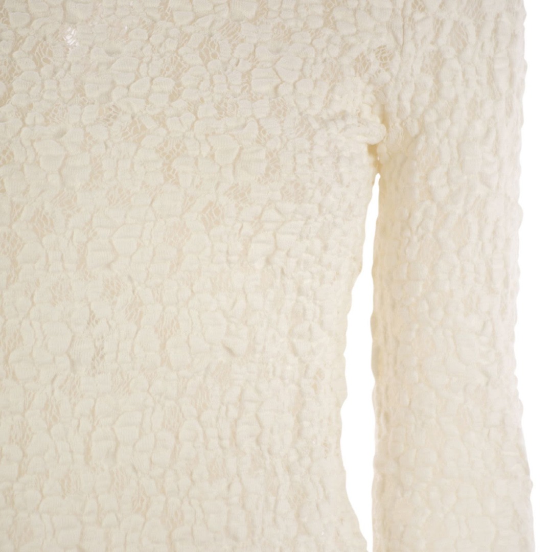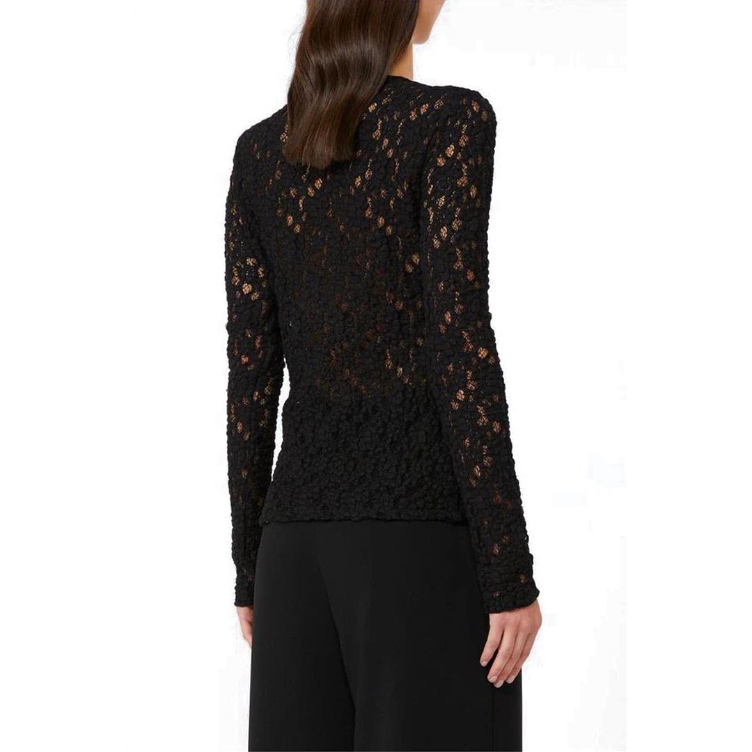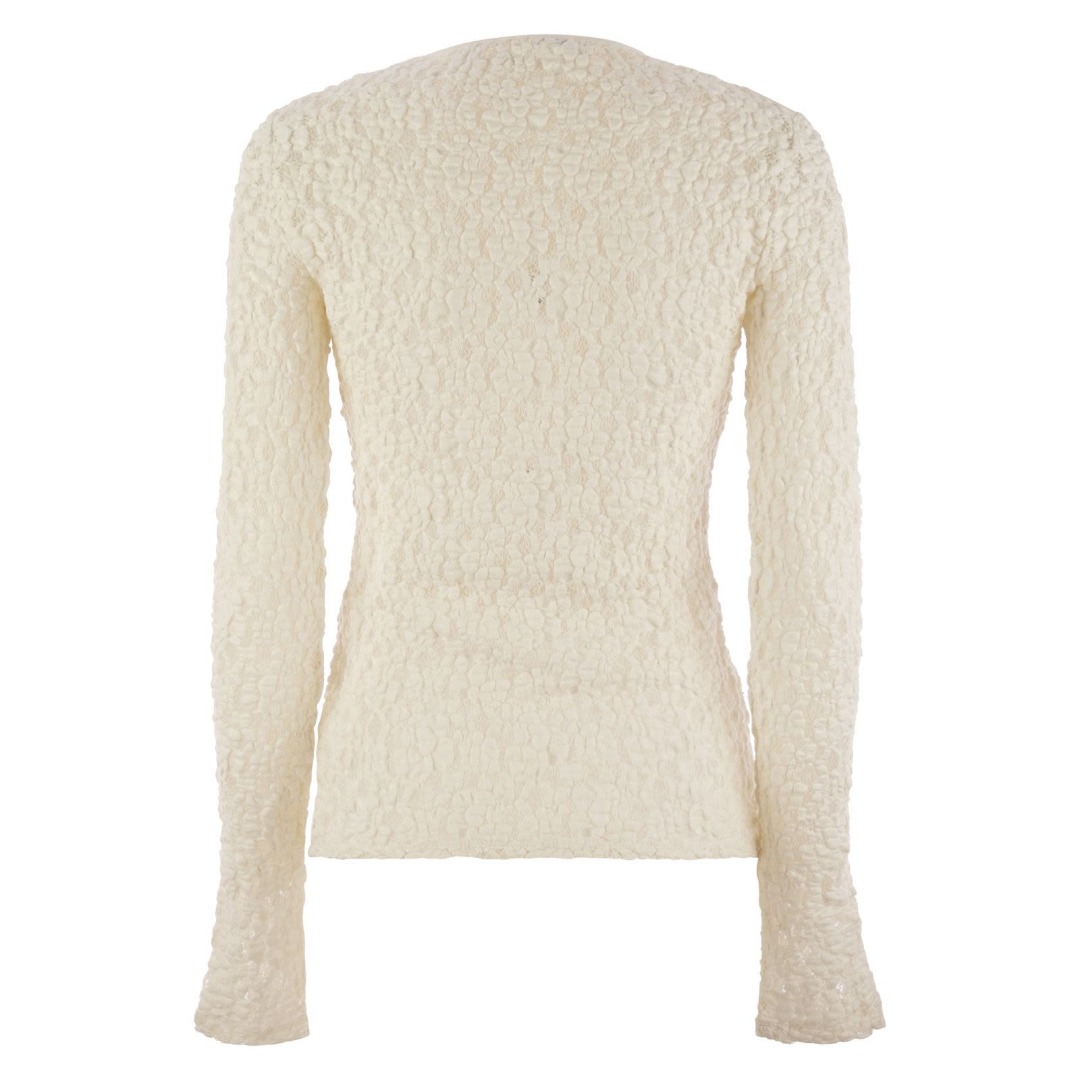 Maglia in pizzo cloquè stretch di cotone dalla silhouette sensuale e femminile. Caratterizzata da maniche lunghe e vestibilità aderente. - Linea aderente - Girocollo - Maniche lunghe