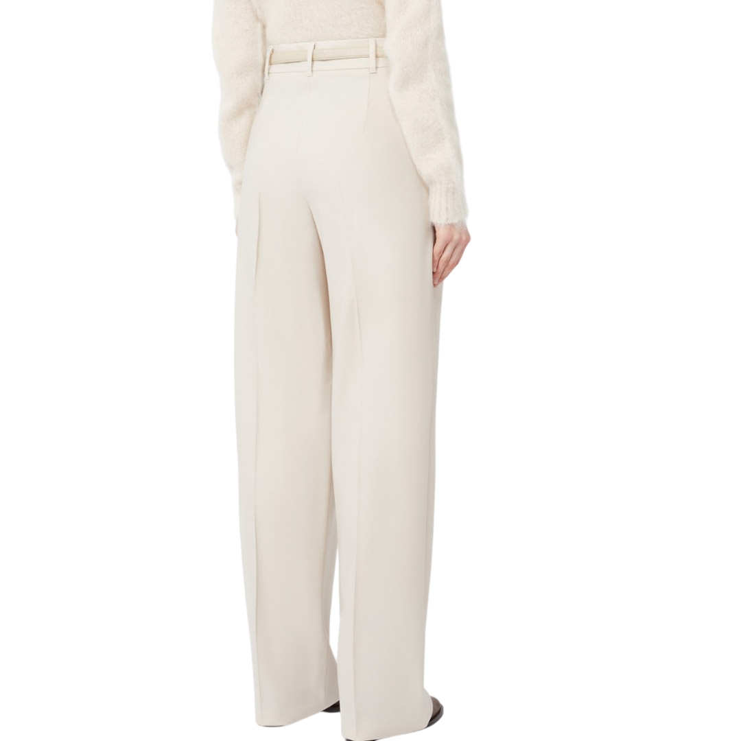 Pantalone maschile realizzato in pregiata saglia di lana con doppia pinces in vita sul davanti. Silhouette scivolata con gamba leggermente più stretta sul fondo, per un look versatile. Pantalone in saglia di lana stretch Linea fluida con gamba larga, leggermente affusolata al fondo Chiusura con listino alto in vita, zip con patta e gancetto Tasche alla francese sui fianchi Cintura abbinata in tessuto spalmato