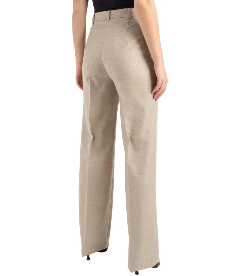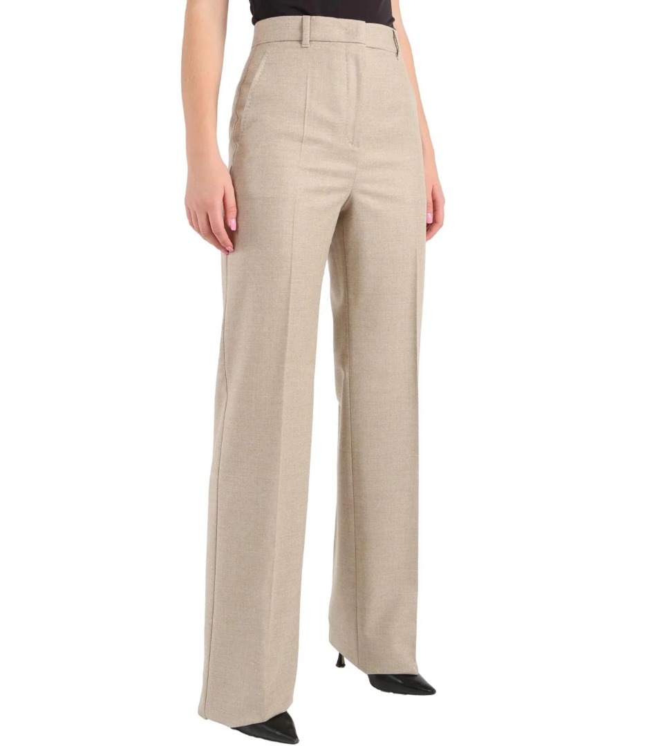 Pantaloni "Lambro" in flanella di lana stretch, beige sabbia, dal taglio sartoriale e silhouette dritta. Presentano vita regolare con listino alto, chiusura a zip con patta e gancetto, piega stirata sul davanti, tasche alla francese e passanti per cintura. Regular fit, eleganti e versatili, ideali per look da ufficio e outfit quotidiani raffinati.