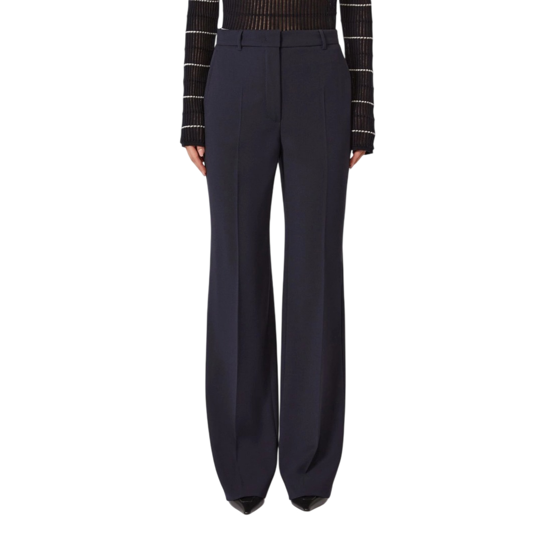 Pantalone straight leg, rifinito con puntino sartoriale Pantalone in crêpe satin di lana comfort Linea dritta Chiusura con listino alto in vita, zip con patta e gancetto Tasche alla francese sui fianchi Pinces cucite in vita sul retro Passanti per cintura e piega stirata