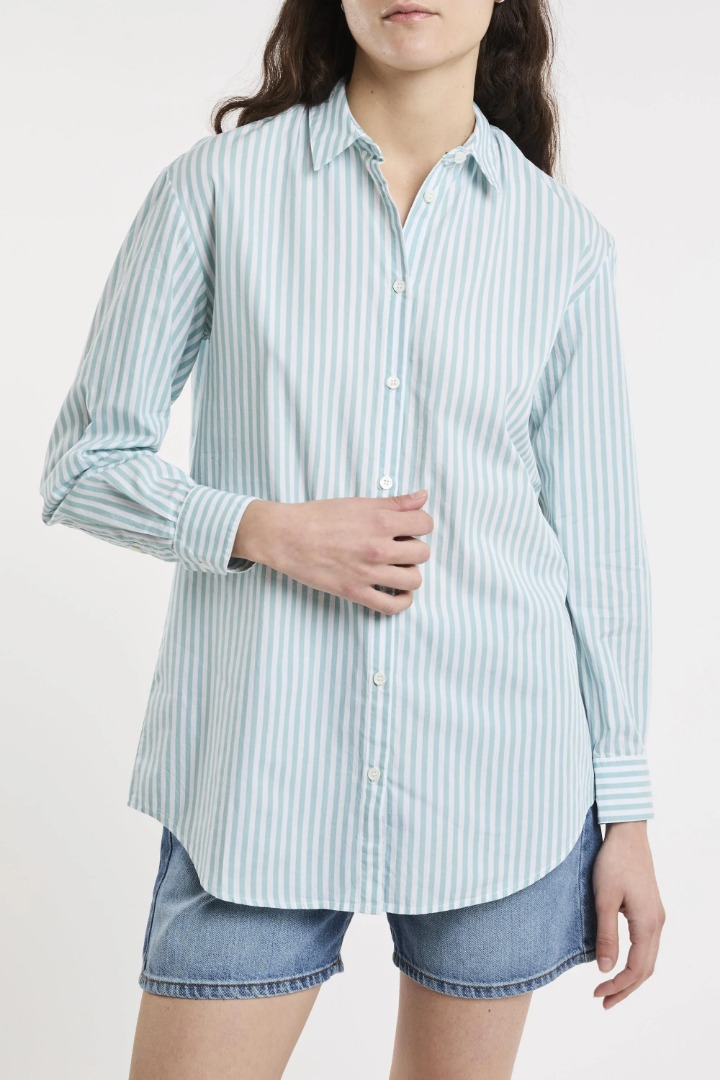 La nostra camicia Brigitte dal taglio rilassato presenta una lunghezza maggiore rispetto alla vestibilità classica, offrendo più spazio su petto e vita. Perfetta per l'estate, può essere indossata da sola come copricostume o mini-abito, oppure abbinata a shorts, jeans, pantaloni o mini-gonne. Colletto a punta con chiusura a bottoni Apertura con bottoni in madreperla Maniche lunghe con polsini abbottonati Spalle scese Carré posteriore con pieghe sulla pattina Stampa a righe Ricamo Beach Club sulla spalla