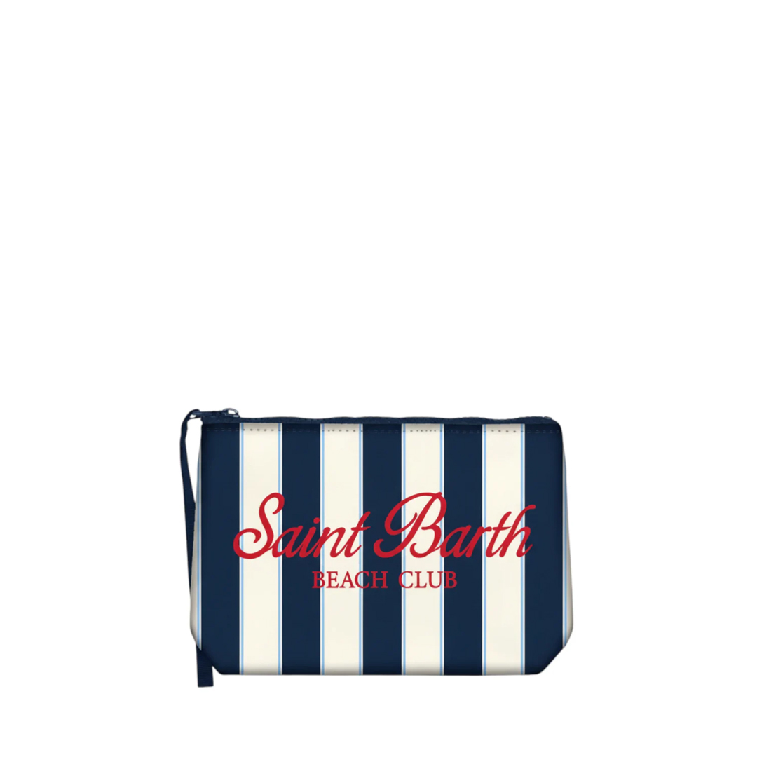 Pochette "Aline Beach Stripes 6131" Saint Barth, colore bianco e blu, fantasia a righe, chiusura superiore con zip, laccetto laterale da polso, stampa logo lettering "Saint Barth Beach Club" frontale. Dimensioni: 20 x 14,5 x 7 cm