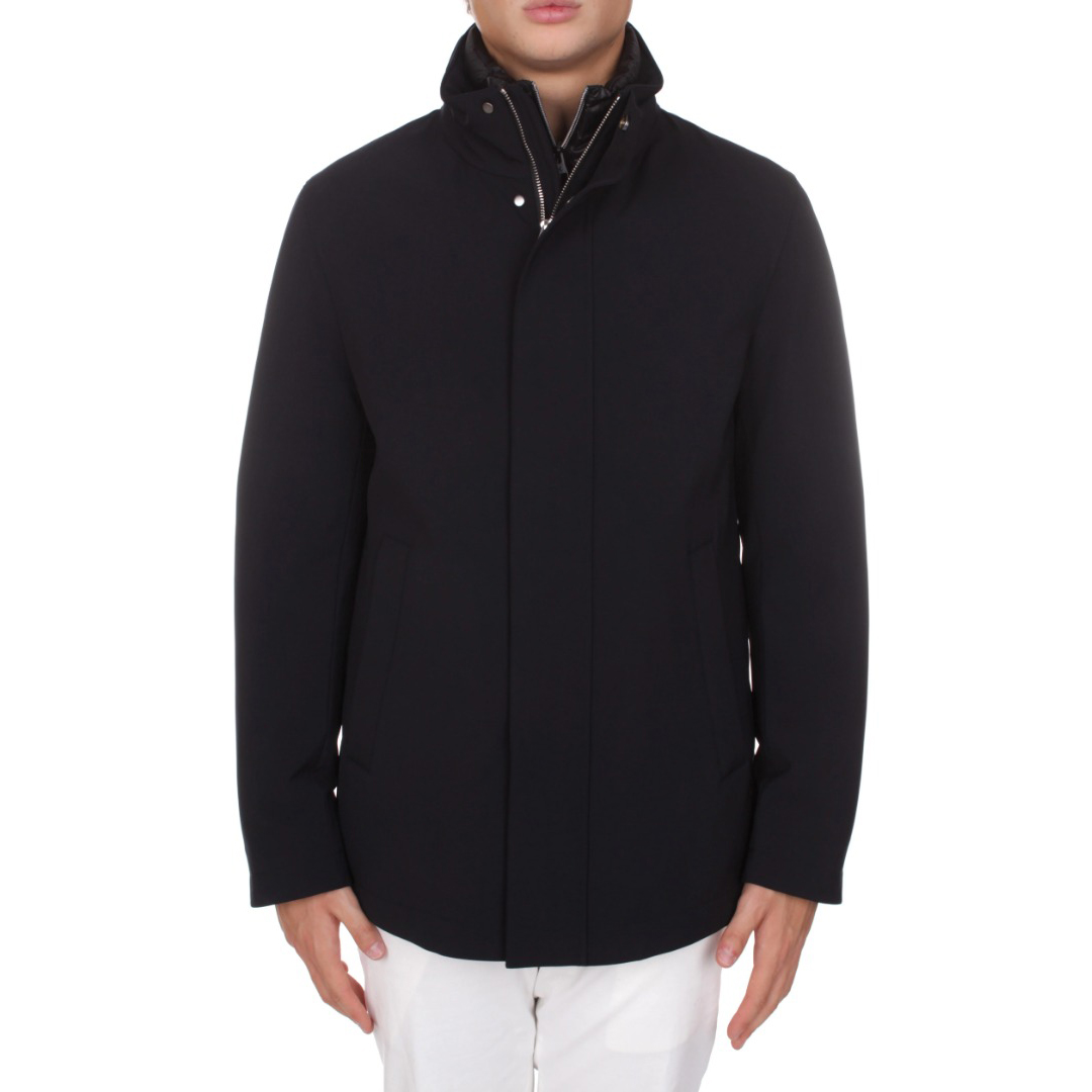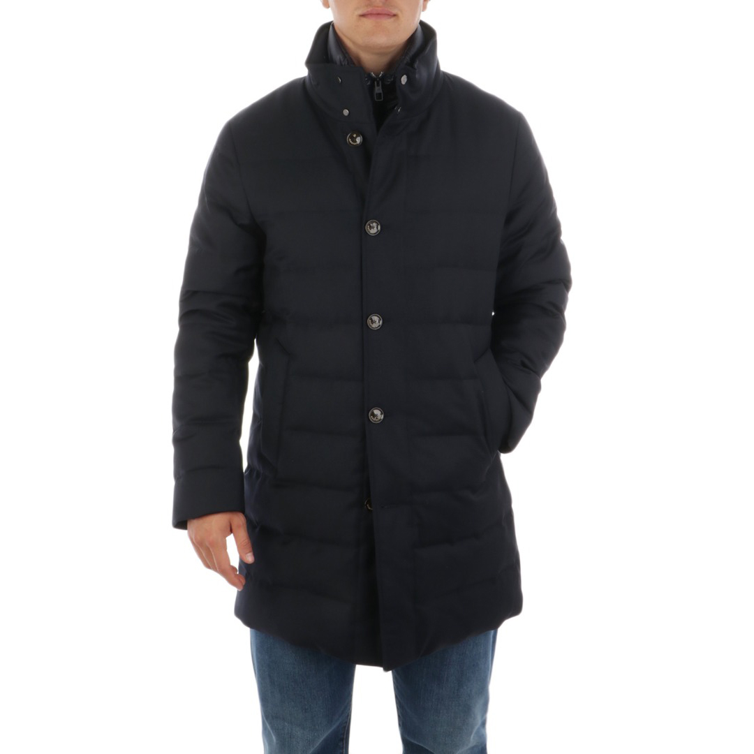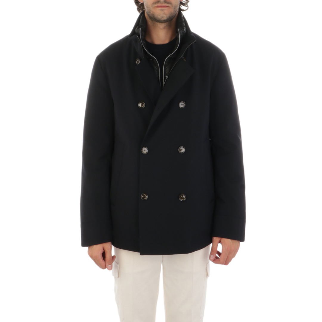Giubbotto da uomo in tessuto tecnico elasticizzato Imbottito in piumino e piuma Chiusura doppiopetto a bottoni Davantino trapuntato removibile con chiusura full-zip Tasche laterali a filo Collo in piedi Vestibilità regolare
