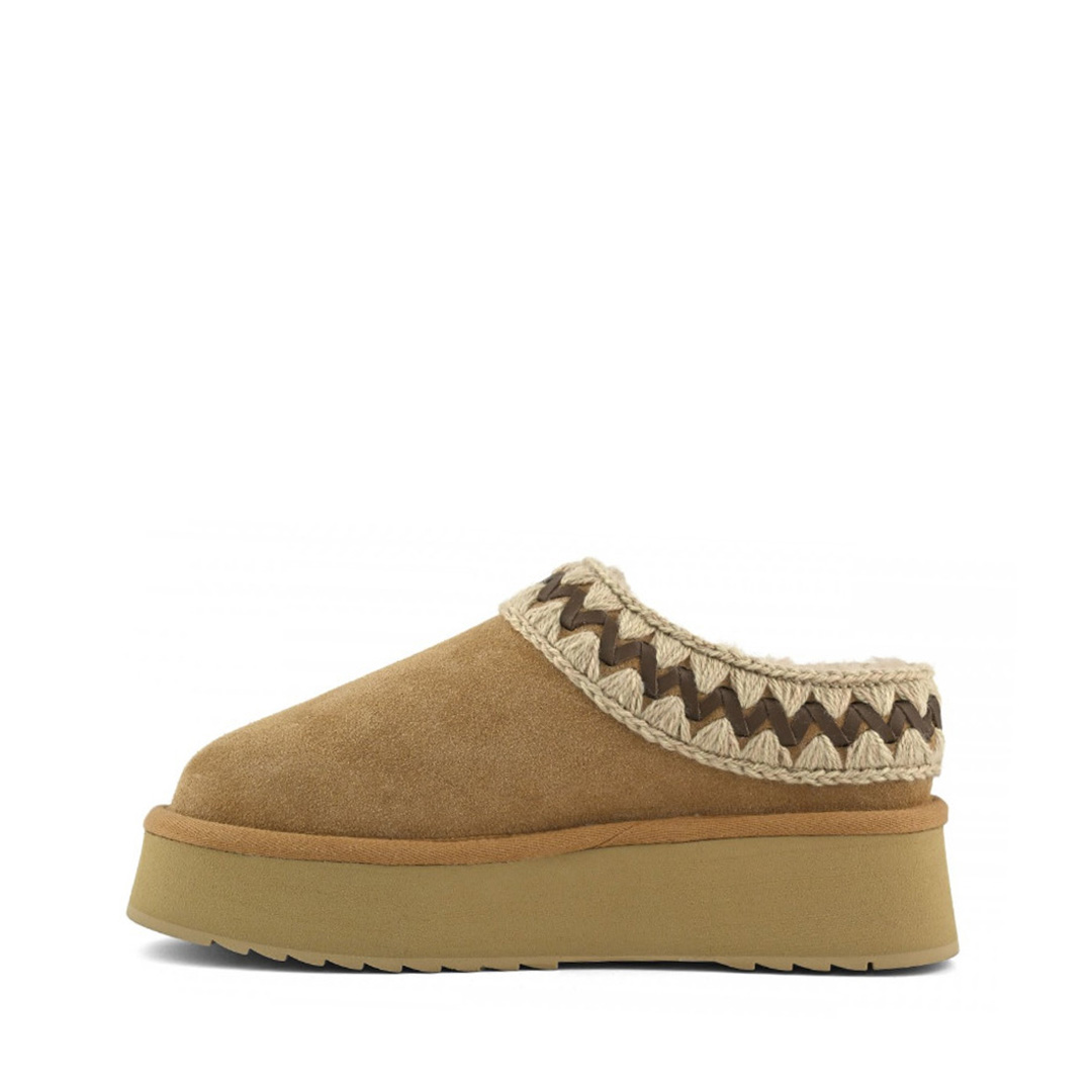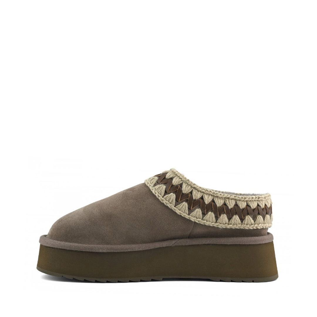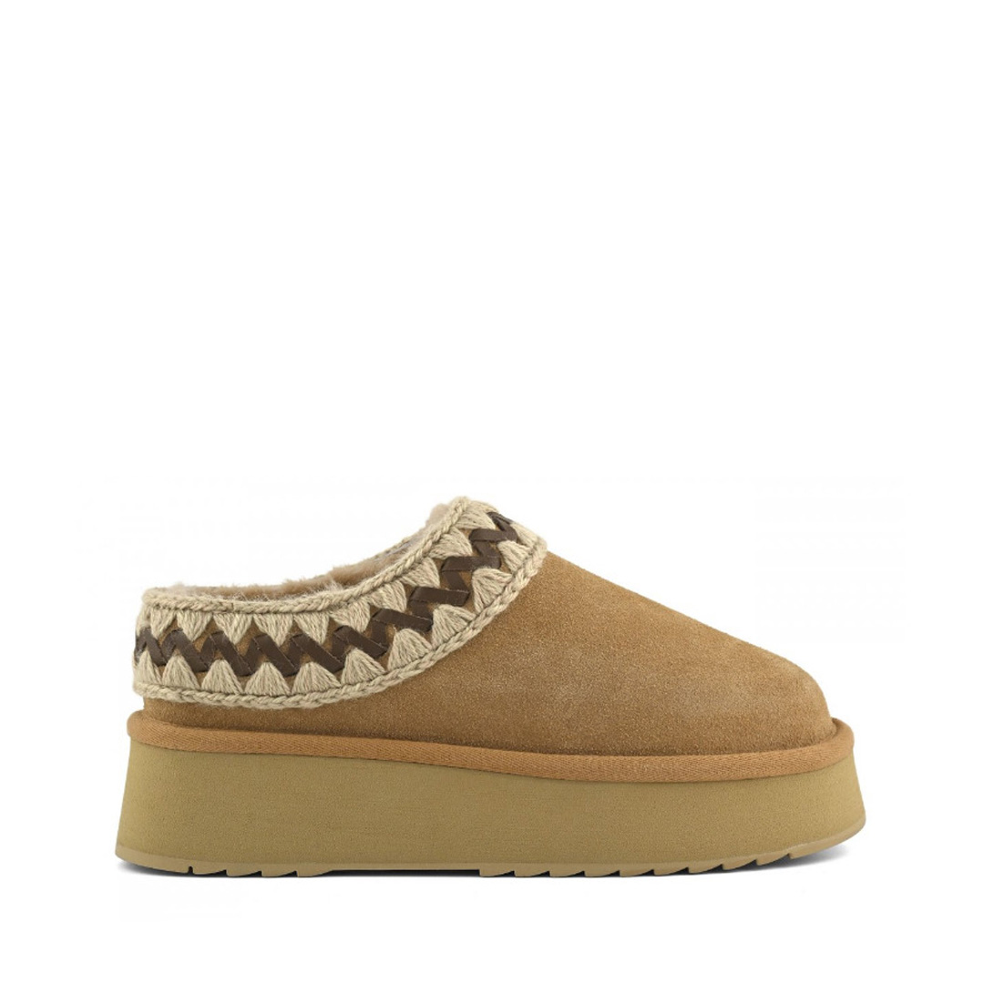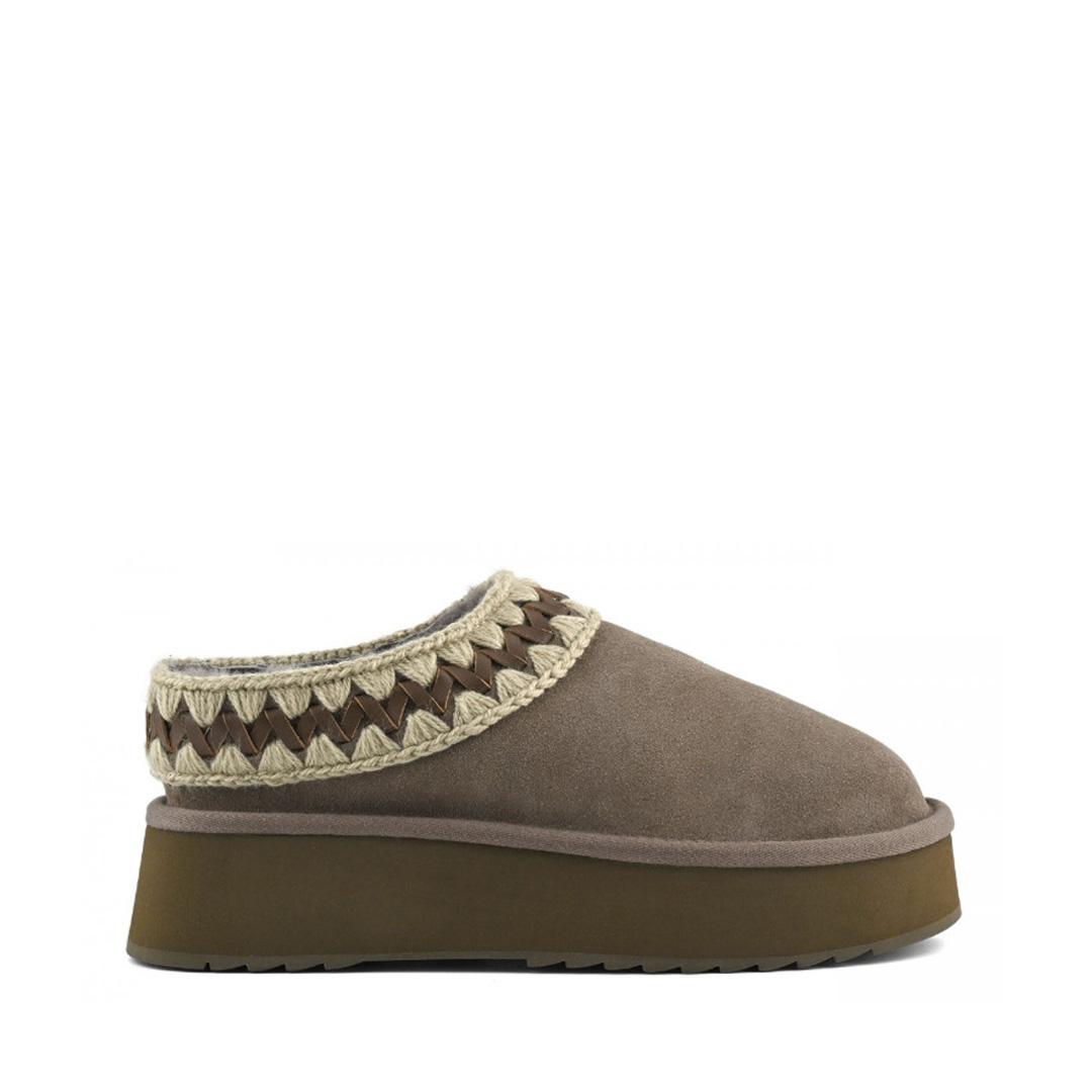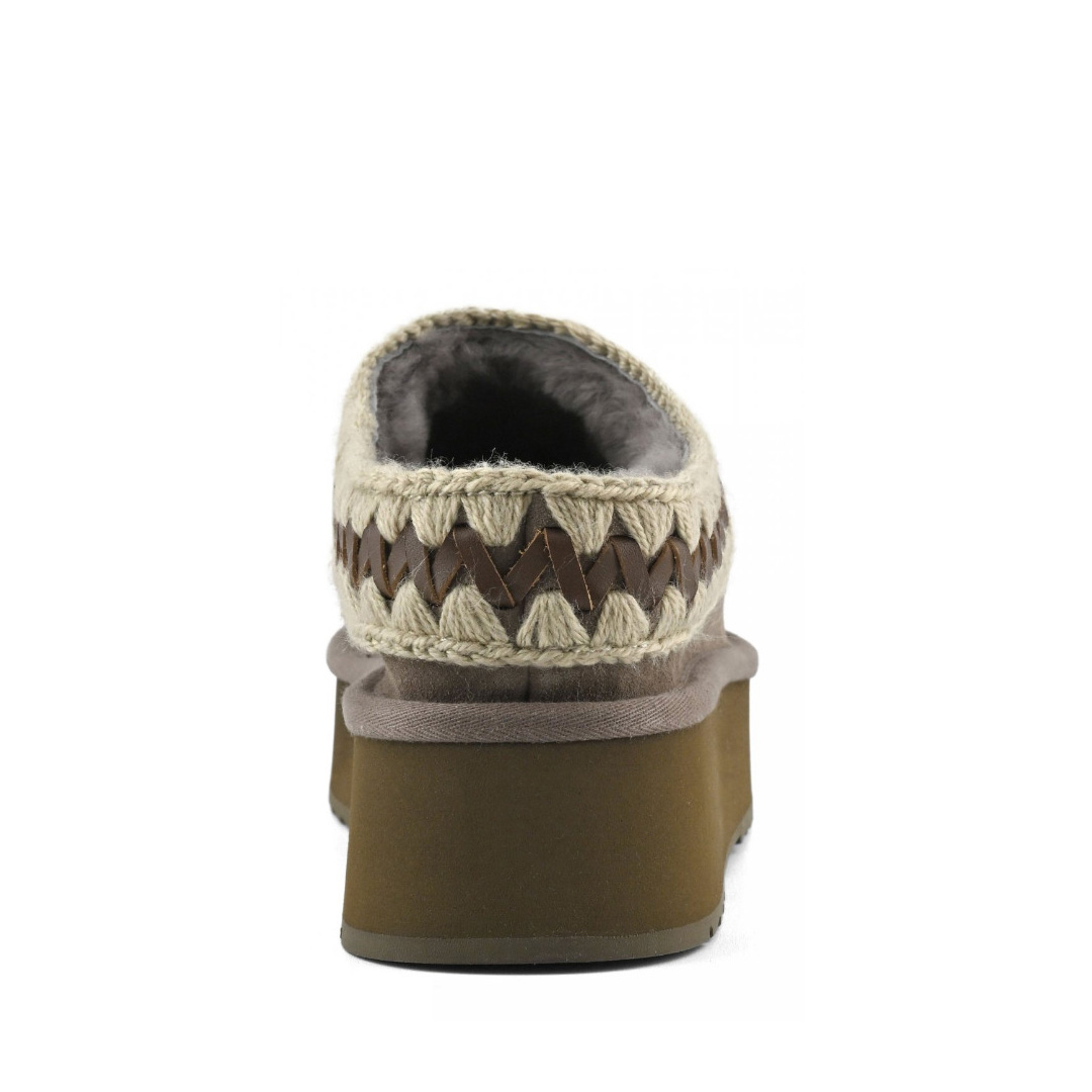 Novità per l'autunno-inverno 2025: il platform clog di mou è un nuovo e meraviglioso modello sapientemente realizzato a mano in vero montone double-face e arricchito dagli inconfondibili dettagli in lana all'uncinetto firmati mou. Incredibilmente confortevole e resistente con suola in gomma EVA. Altezza: 4 cm.