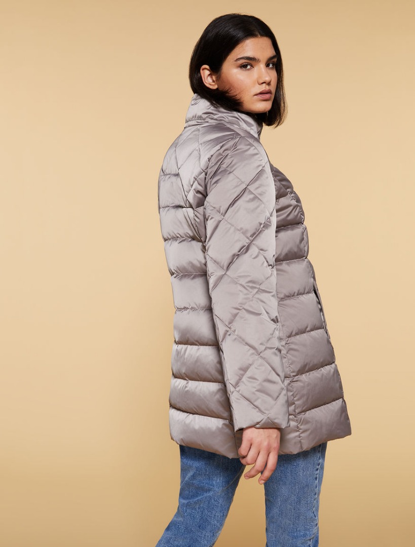 Piumino in raso couture, dalla linea semiaderente con tagli fianchetto davanti e dietro, trapuntature a contrasto, collo alto, maniche lunghe, tasche inserite ai fianchi. Chiusura coperta con bottoni a pressione. Imbottitura in vera piuma. Il capo viene consegnato con collo in lapin coordinato.