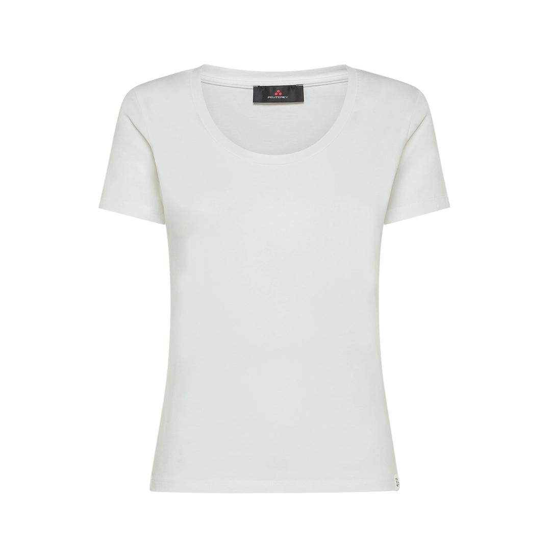 T-shirt realizzata in jersey di cotone stretch con girocollo ampio, maniche corte e personalizzazione con etichetta con logo al fondo. Un capo versatile e femminile, perfetto per completare con semplicità e stile ogni outfit estivo. Vestibilità: regular Collo ampio Personalizzazione con logo al fondo In jersey di cotone stretch