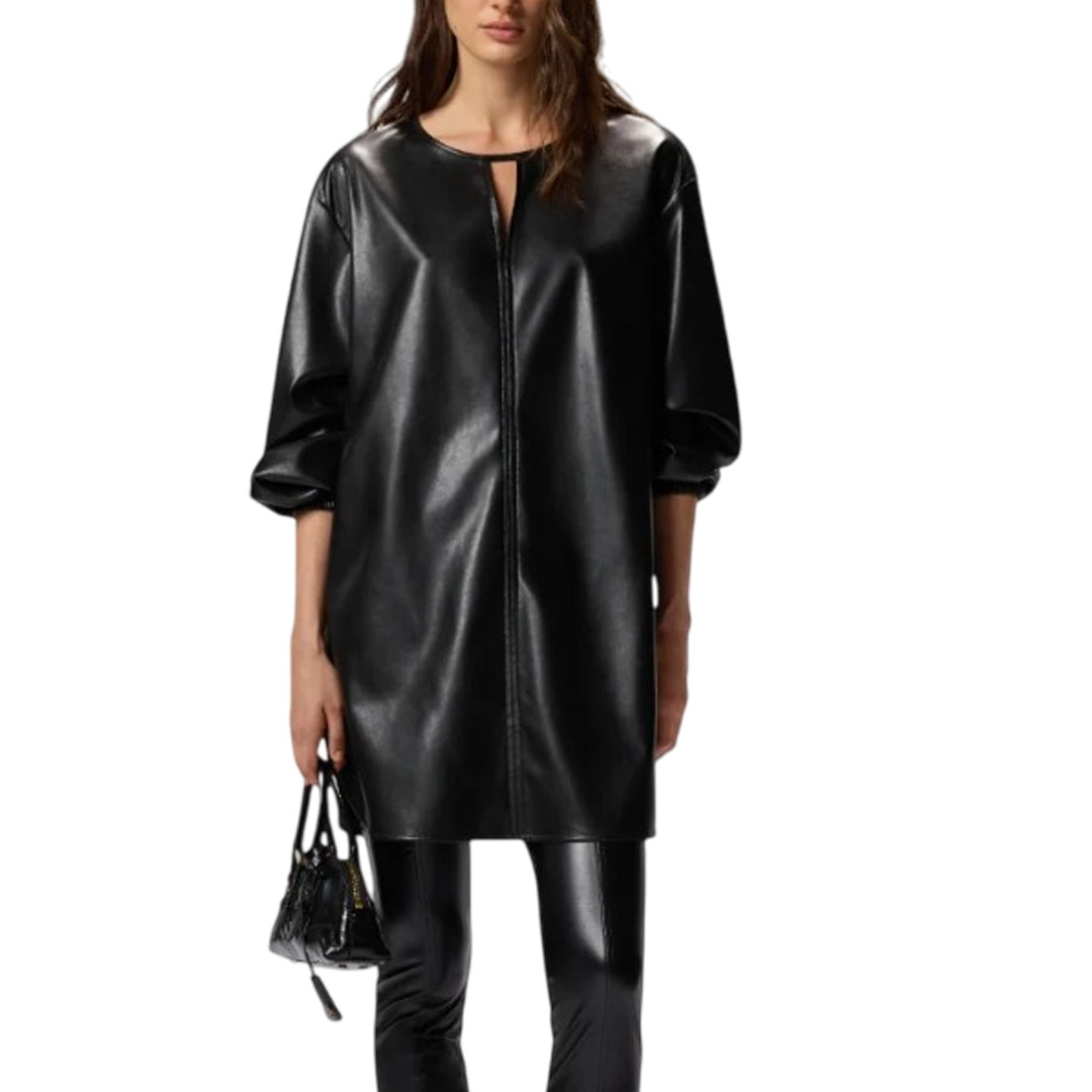 Abito corto SFUMATO effetto pelle con scollo a V, maniche morbide e cintura con fibbia Love Birds. Look grintoso e femminile, perfetto per outfit di carattere.L’abito corto SFUMATO di PINKO è il capo ideale per chi vuole esprimere un look grintoso e contemporaneo senza rinunciare alla femminilità. Realizzato in tessuto spalmato similpelle, offre una mano morbida e un effetto finale elegante e deciso, perfetto per distinguersi in ogni occasione. Il modello presenta un collo tondo con apertura a V sul davanti, maniche lunghe morbide con spalla scesa e polsino elasticizzato che donano comfort e fluidità. La vestibilità sfiancata, più aderente sui fianchi, valorizza la silhouette, mentre la cintura abbinata in tessuto effetto pelle con fibbia Love Birds Diamond Cut in metallo aggiunge un dettaglio iconico e ricercato.