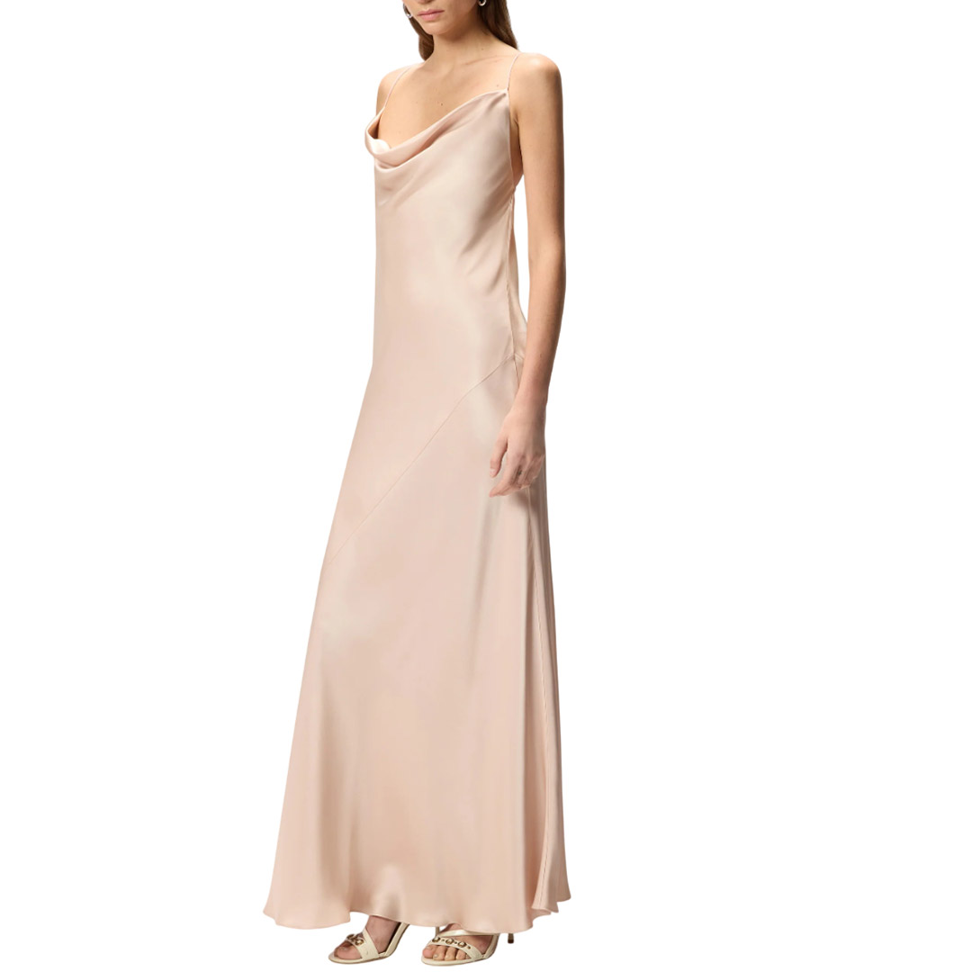 Abito lungo dalla silhouette a sottoveste con spalline sottili, morbido scollo frontale drappeggiato e ampio scollo tondo sul retro che lascia la schiena scoperta, attraversata solo da due nastrini da annodare al centro. Il modello firmato PINKO è realizzato in morbido e lucente satin double face, un tessuto dall'aspetto uniforme sia all'esterno sia all'interno, che accompagna il corpo con delicatezza e permette di ottenere una vestibilità fluida e leggera. Il vestito, elegante e femminile, è un outfit perfetto per cerimonie e cocktail party.