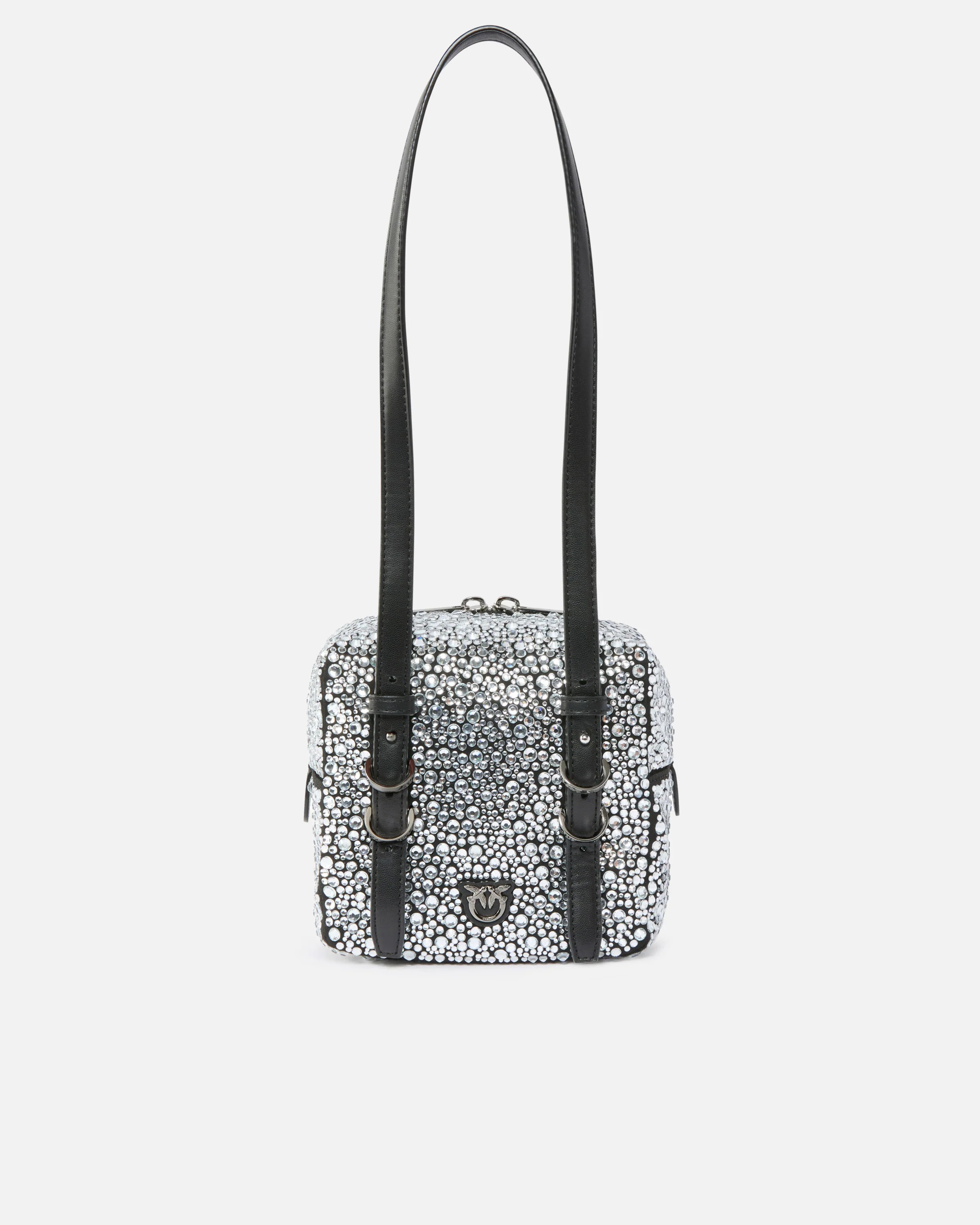 Borsa piccola Cubic Bag dal design compatto che richiama la forma di un cubo, imbottita e interamente ricoperta di strass di diverse dimensioni, per uno omaggio allo stile scintillante che contraddistingue PINKO. Il modello presenta due lunghi manici regolabili che fungono da tracolla, consentendo di indossarlo crossbody oppure a spalla, ed è personalizzato da una piccola patch frontale con l'iconico logo metallico Love Birds Diamond Cut. La chiusura con zip a doppio cursore rivela un interno capiente, perfetto per avere sempre a portata di mano tutti i tuoi oggetti essenziali. Attiva la tua borsa PINKO: verifica l'autenticità del tuo prodotto e accedi all'esperienza personalizzata avvicinando il tuo smartphone al ricamo Love Birds che trovi sul retro della borsa! H: 17.0 cm W: 13.0 cm L: 16.0 cm