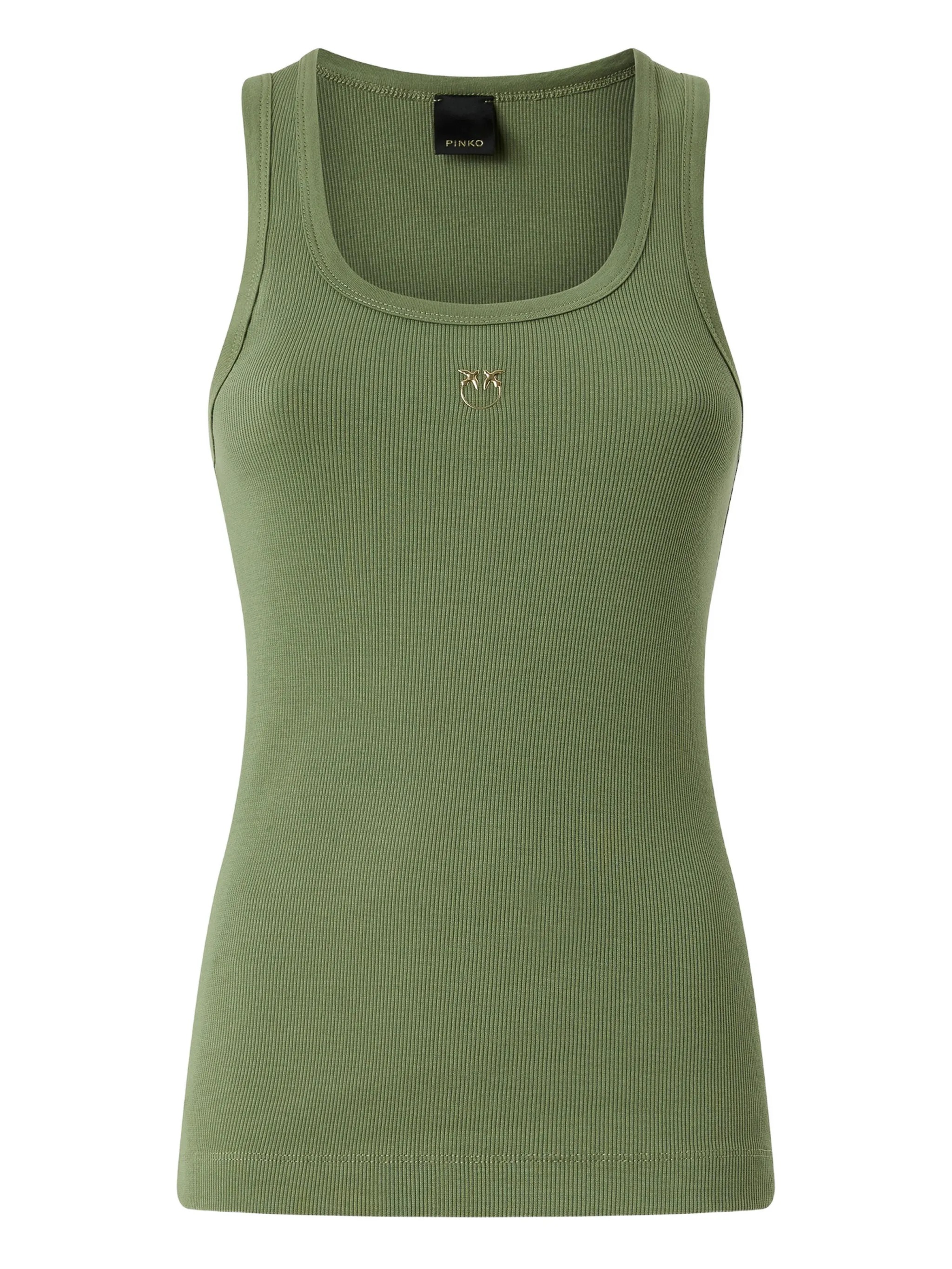 Canotta realizzata in morbido jersey di cotone stretch lavorato a costine sottili e impreziosita da un'applicazione dorata con logo Love Birds sul petto, per un tocco di luce in puro stile PINKO. Il capo risulta particolarmente versatile, abbinalo con facilità a una gonna raffinata o a dei jeans per le occasioni più informali. - CALCOLATORE TANK TOP