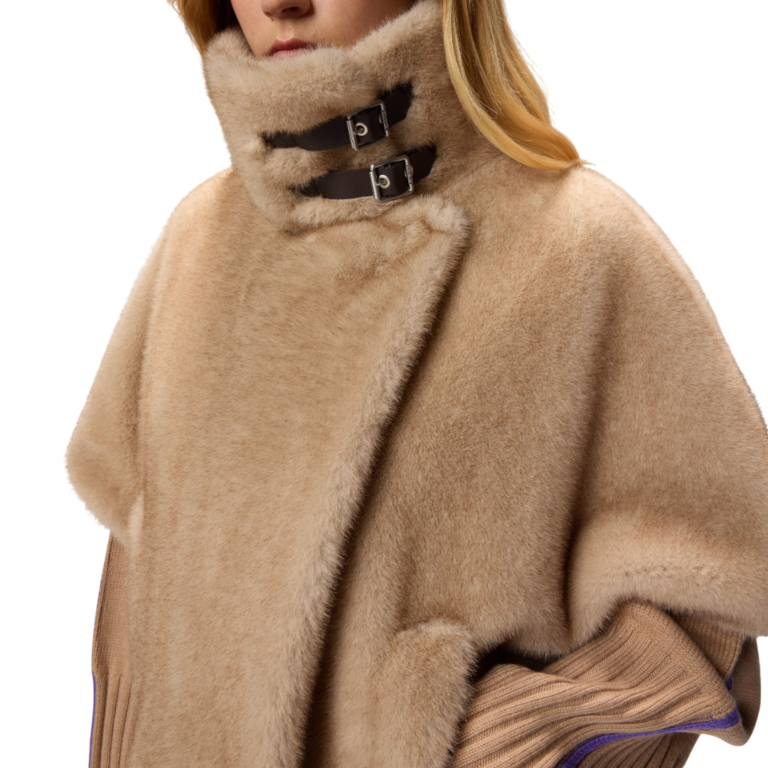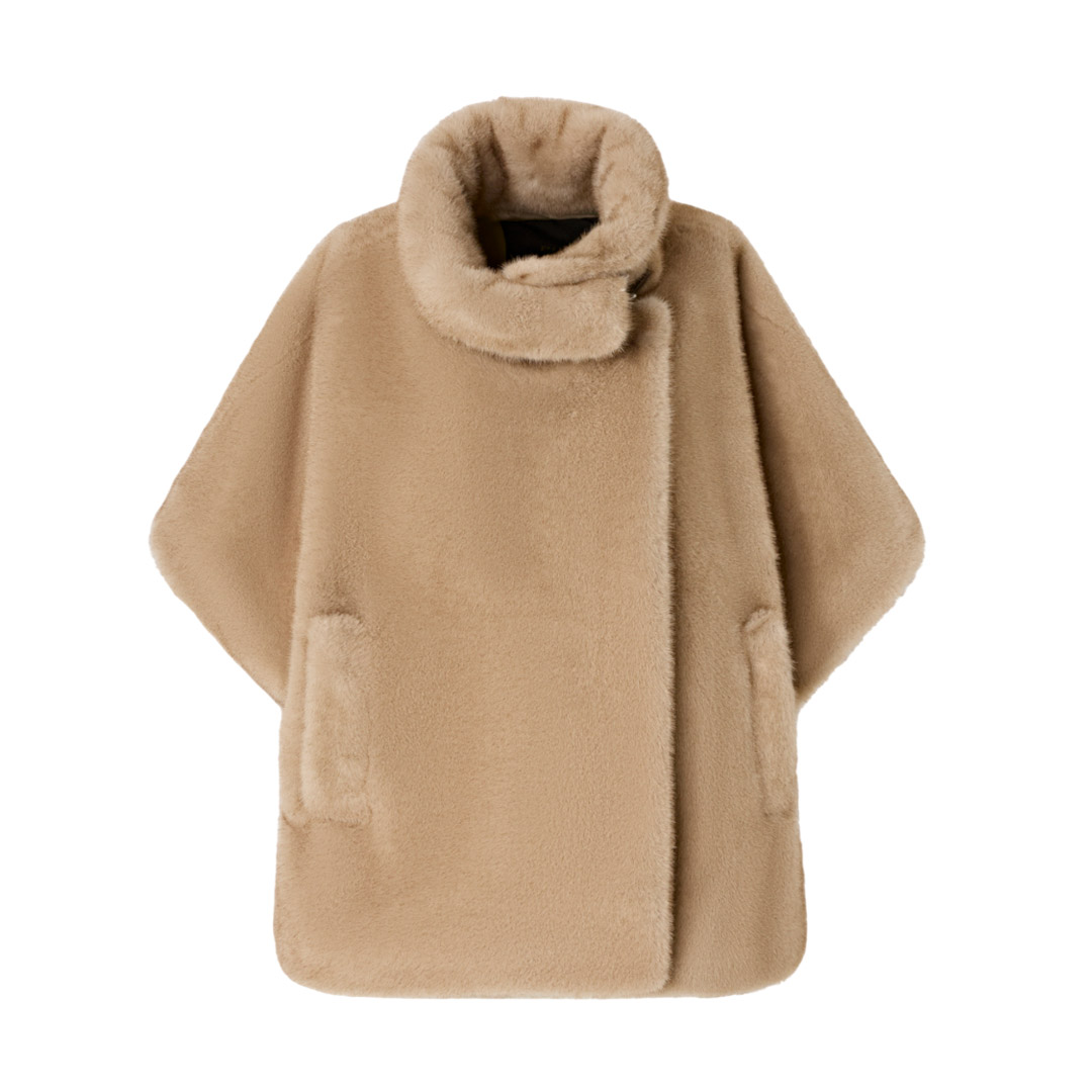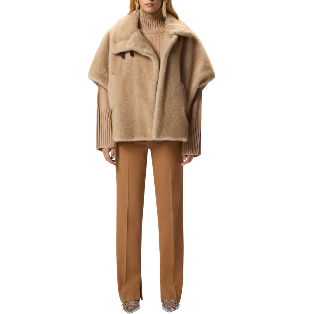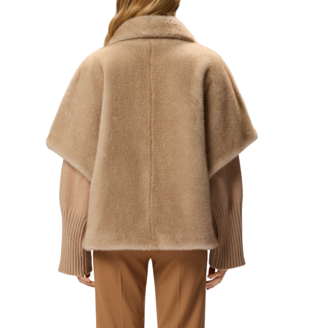 Cappa corta con maniche corte, tasche a filetto, avvolgente collo ripiegato e chiusura frontale decentrata. Il capo è realizzato in morbido tessuto Aspen dall'effetto pelliccia, particolarmente piacevole al tatto. Modello foderato. Il capospalla è ideale per accompagnarti nelle giornate più fresche di inizio stagione all'aperto, con il massimo comfort, senza rinunciare a un tocco di stile.