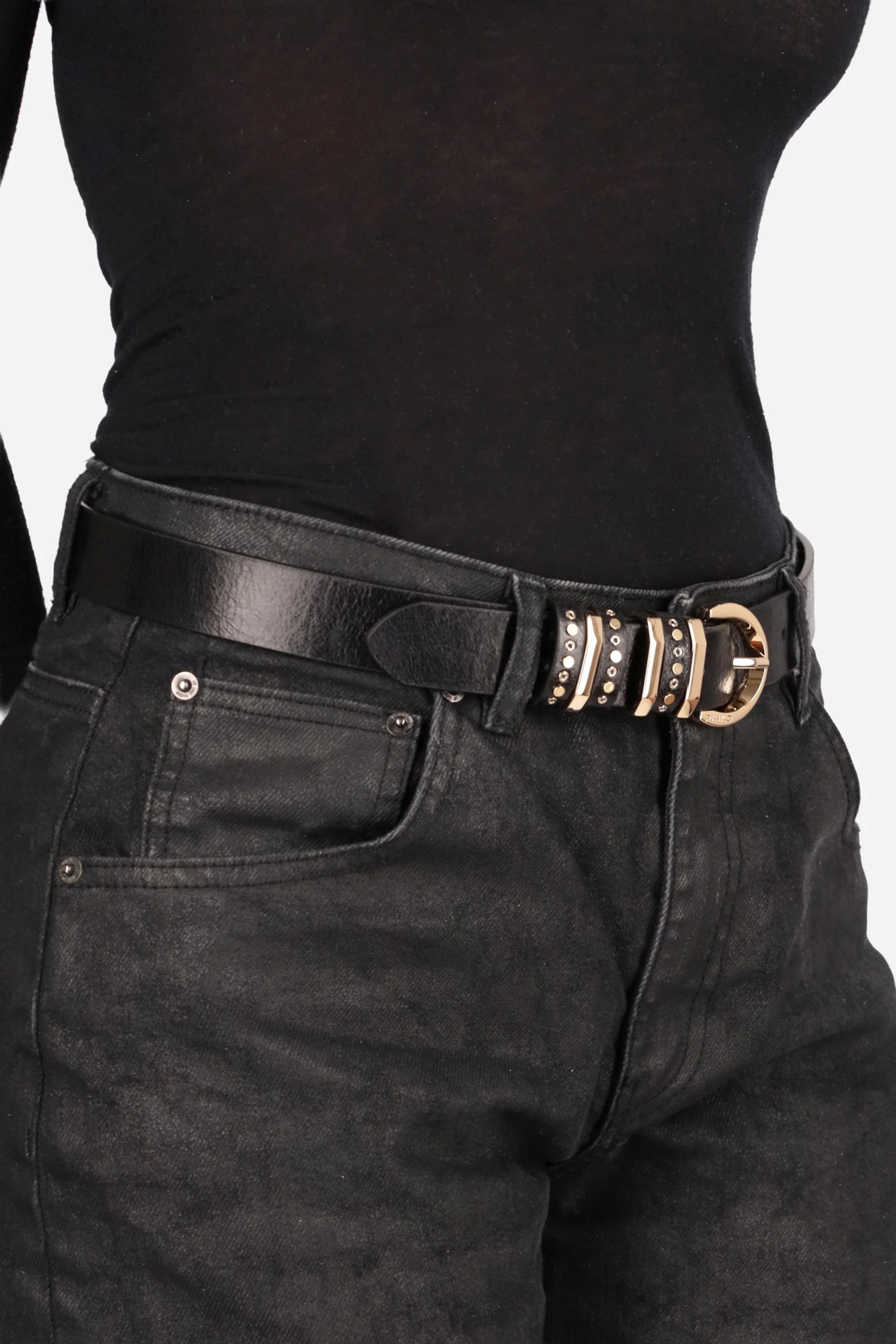 La cintura è realizzata in pelle di vitello con borchie e passanti con dettagli, fibbia logata e regolabile. Altezza 3 cm