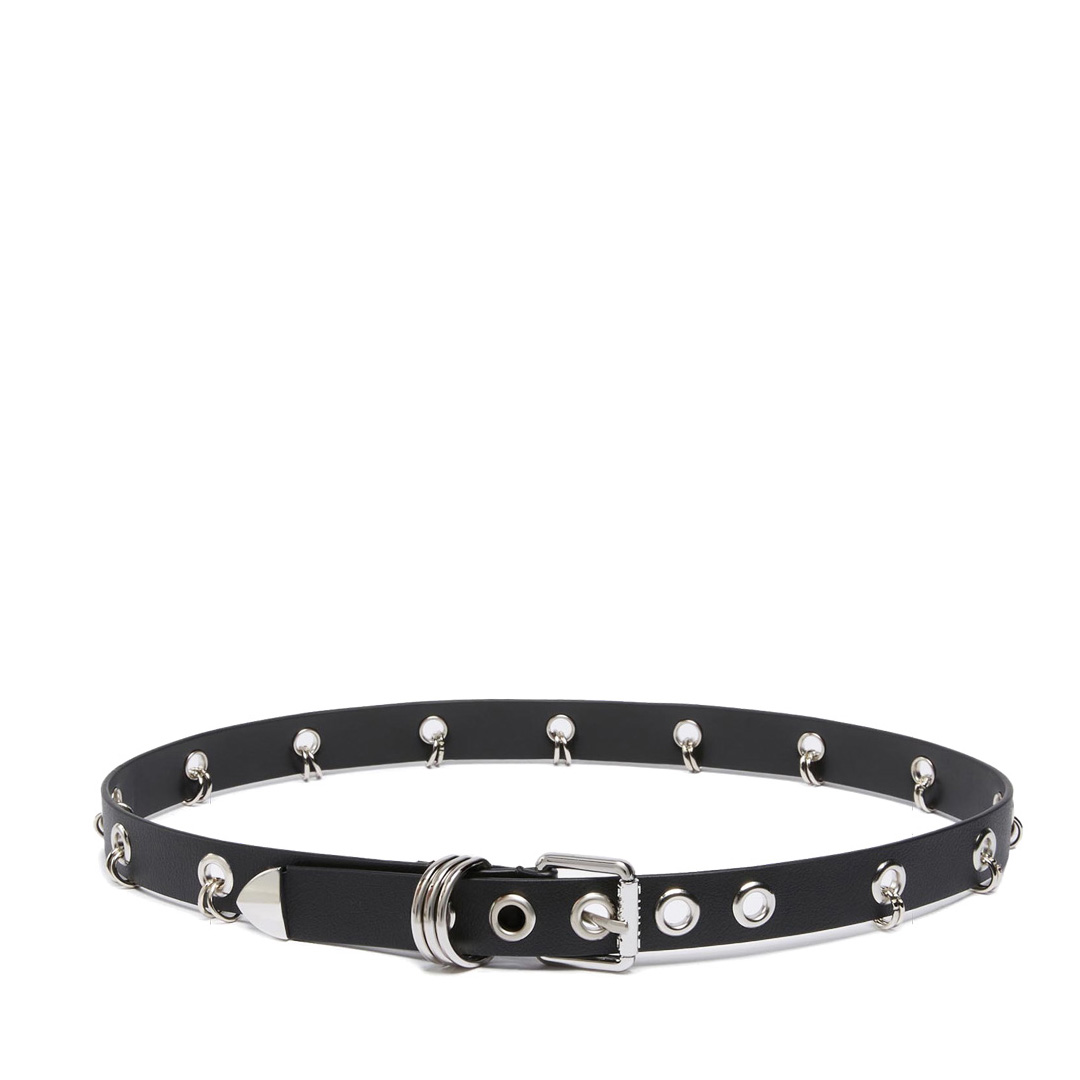 Cintura sottile, alta 2,5 cm, in morbida pelle liscia con occhielli in metallo completati con piccoli anellini applicati, stile piercing. Fibbia a rulla dalla forma squadrata in metallo e passanti ad anello, sempre in metallo. Altezza: 4 cm Lunghezza: 110 cm