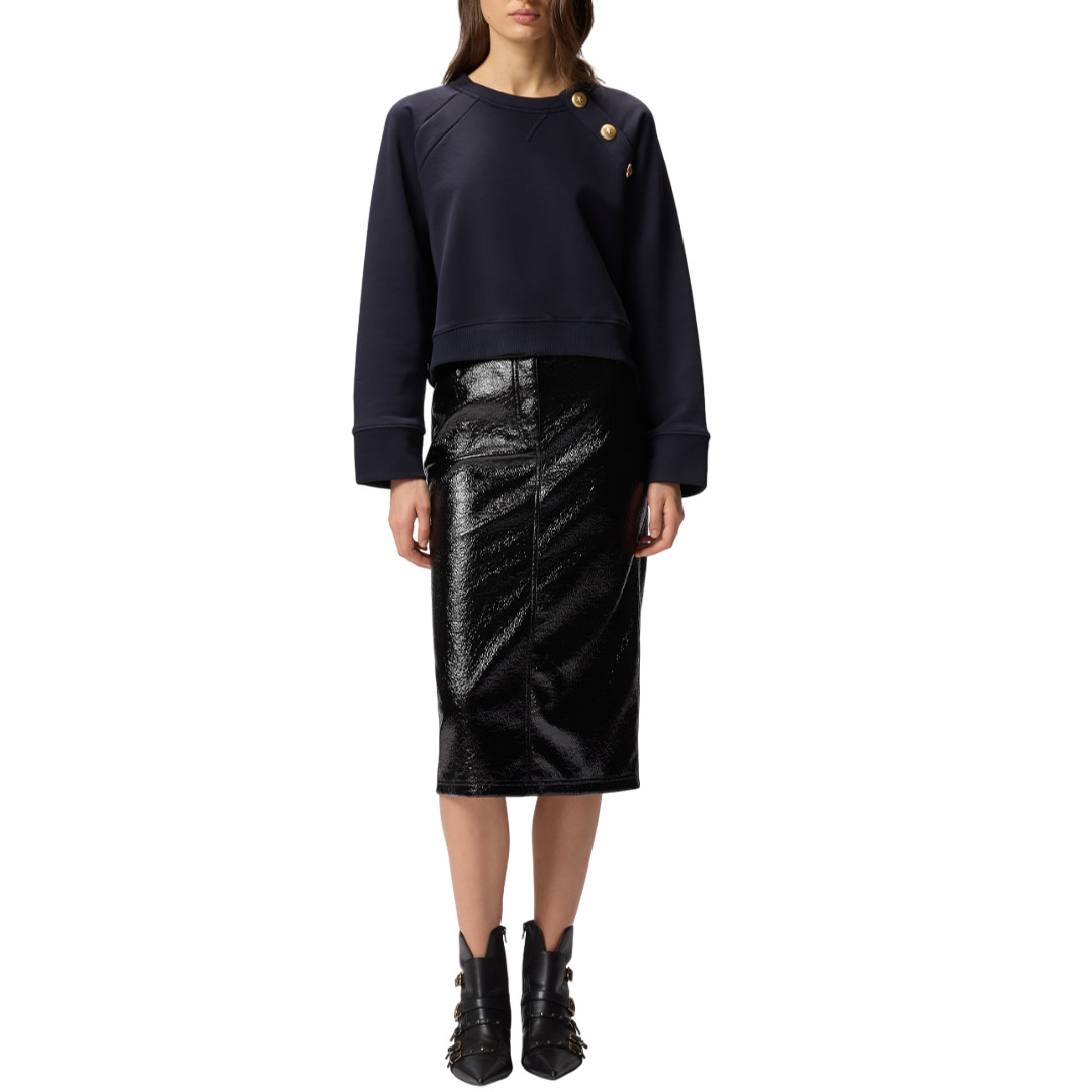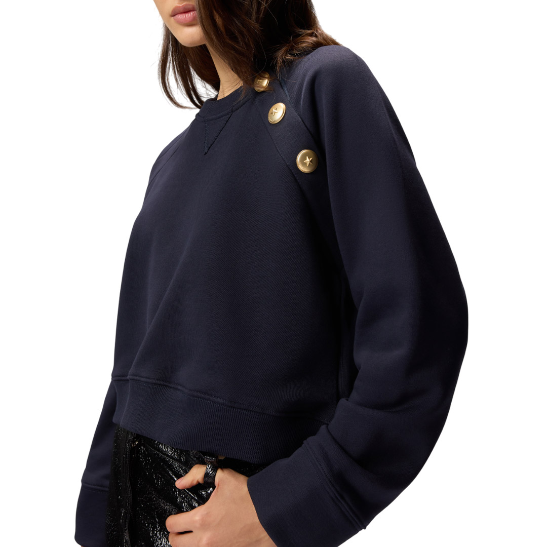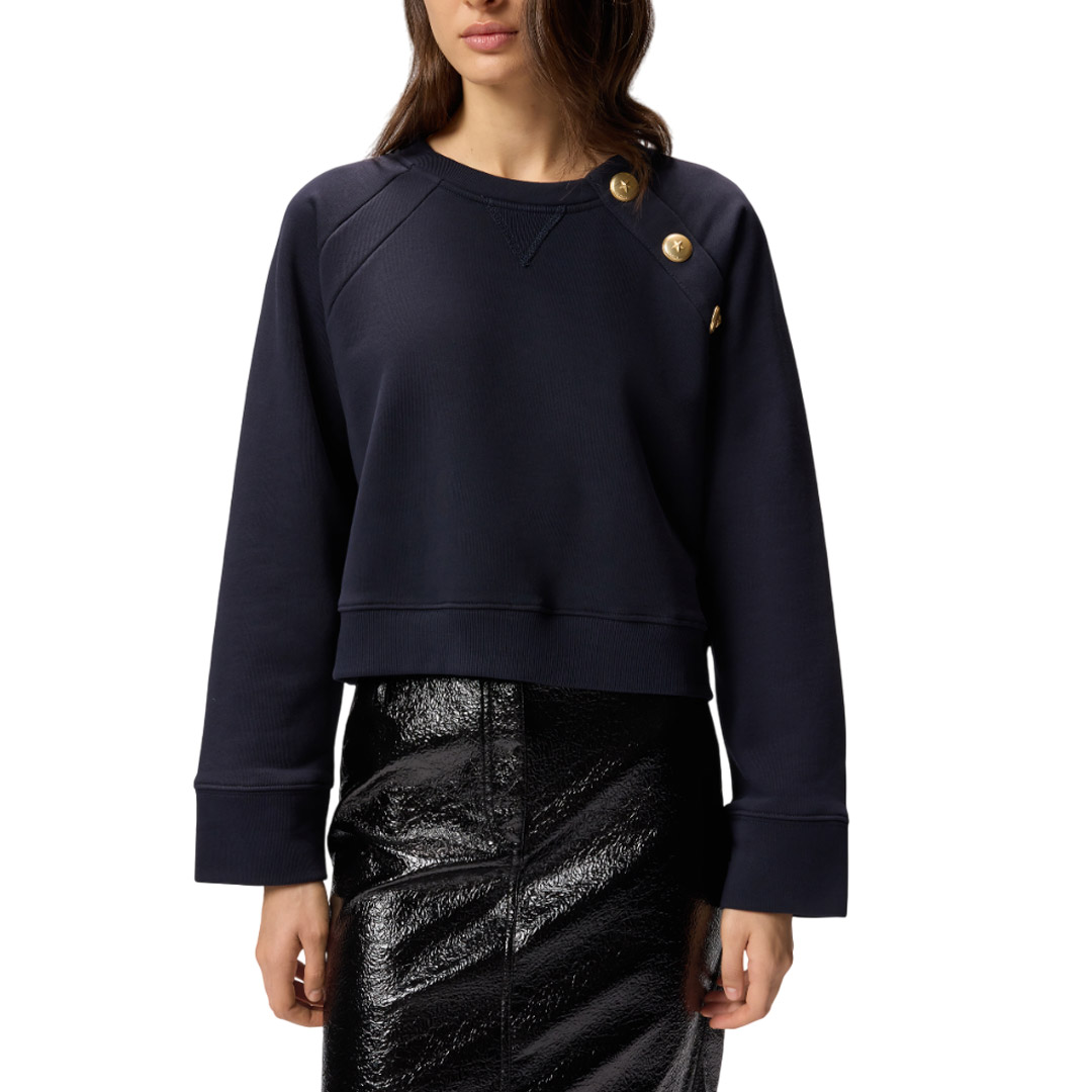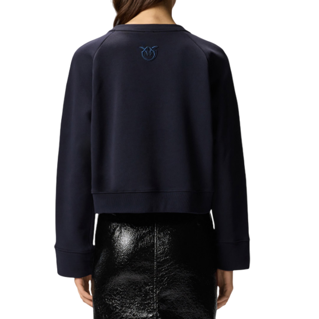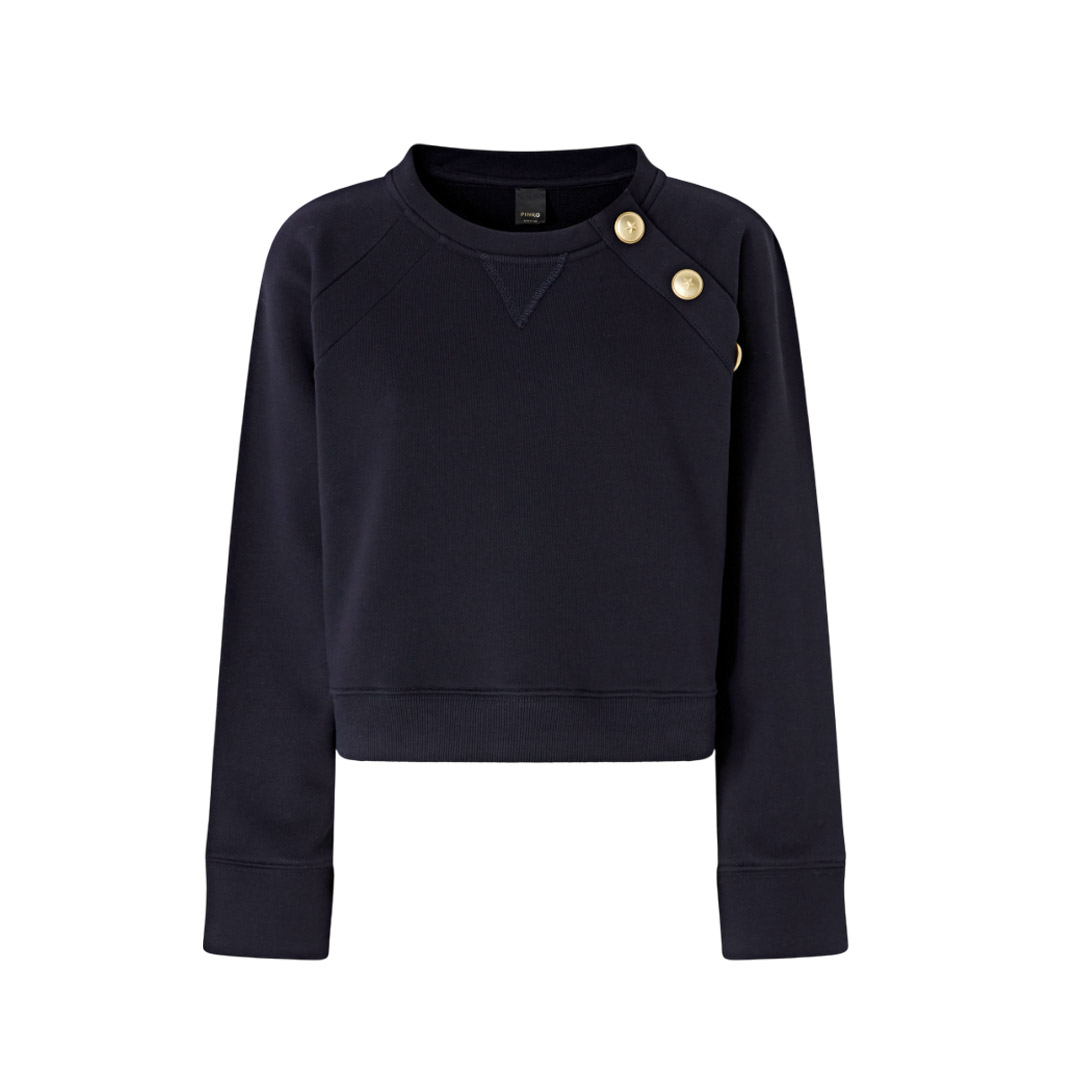 Felpa in cotone con maniche lunghe raglan e inserto triangolare a V in corrispondenza del girocollo. Il taglio delle spalle è chiuso da bottoni in metallo decorati da stella. Il retro è rifinito da una patch ricamata con logo Love Birds: un dettaglio personalizzato in puro stile PINKO. Indossa questo capo con i tuoi jeans preferiti per ottenere un look casual e contemporaneo.
