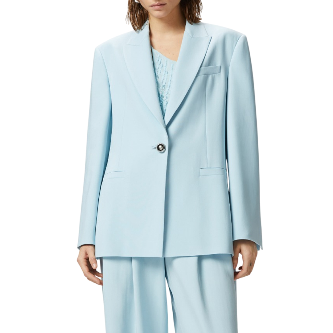 Giacca blazer elegante in tessuto cady tecnico, caratterizzato da un aspetto pulito, lineare e sofisticato. Il blazer è completato da collo a rever, taschino e tasche a filetto davanti. La fodera interna garantisce il massimo comfort durante l'indosso, mentre la chiusura monopetto è personalizzata con bottone gioiello singolo, che aggiunge un tocco elegante impreziosendo il look. Abbina la giacca con i pantaloni nello stesso tessuto per un tailleur raffinato da indossare per le cerimonie e occasioni speciali.