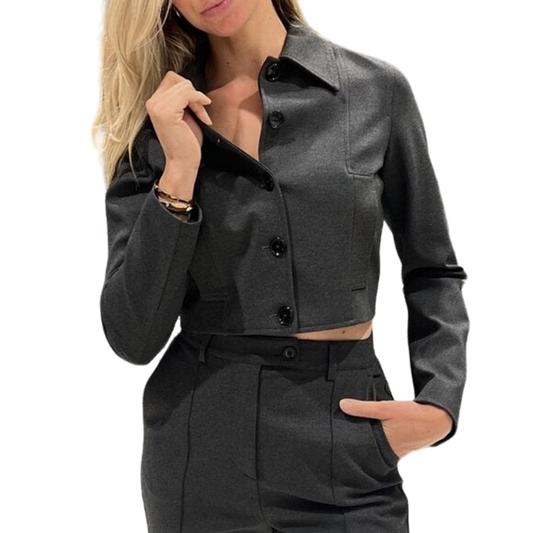 Giacca monopetto dal taglio corto in tessuto tecnico di viscosa stretch lavorato a punto stoffa. La silhouette pulita è completata da colletto a camicia, maniche a giro e tasche a filetto verticale sui fianchi. La giacca è foderata. Chiusura con bottoni davanti.