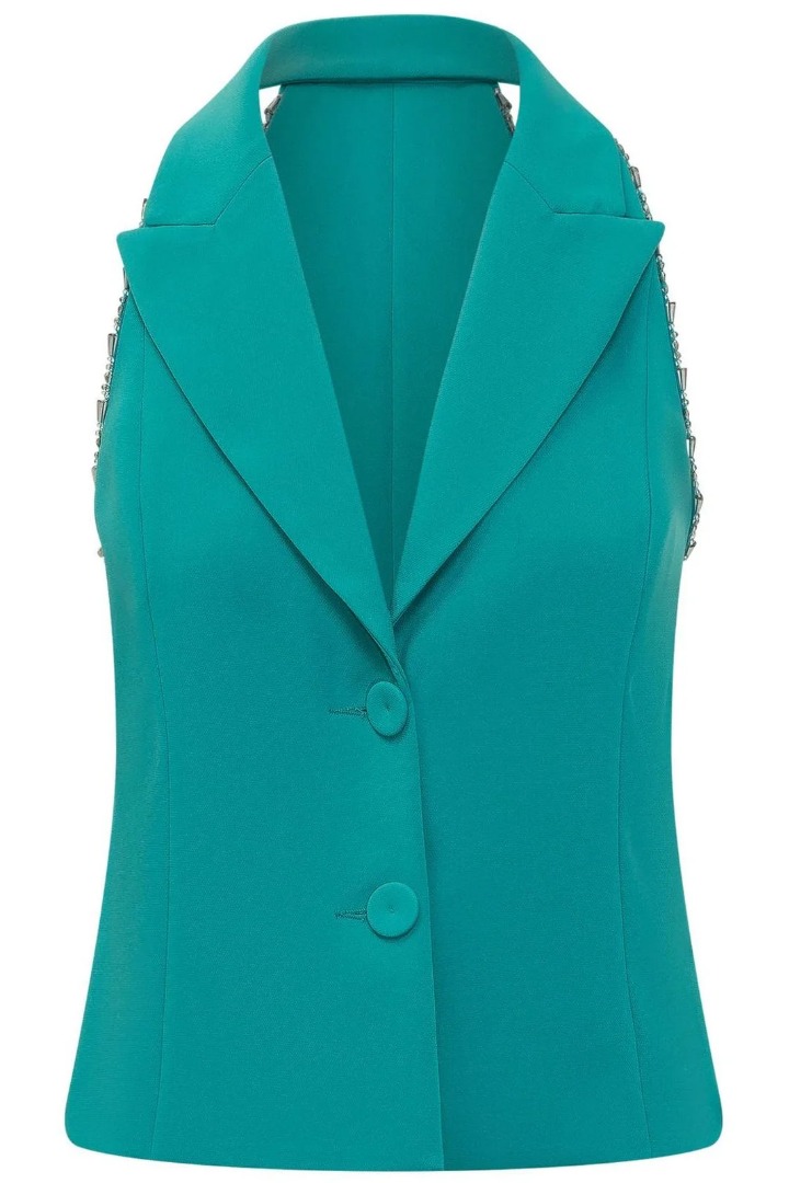 Il vivace colore verde acqua e il colletto con revers a punta conferiscono a questa giacca senza maniche un tocco moderno e minimalista. La vestibilità regolare e la chiusura con bottoni la rendono una scelta elegante per tutti i giorni, sia in ufficio che per le uscite informali, con sottili dettagli argentati lungo i bordi che aggiungono un tocco di raffinatezza.